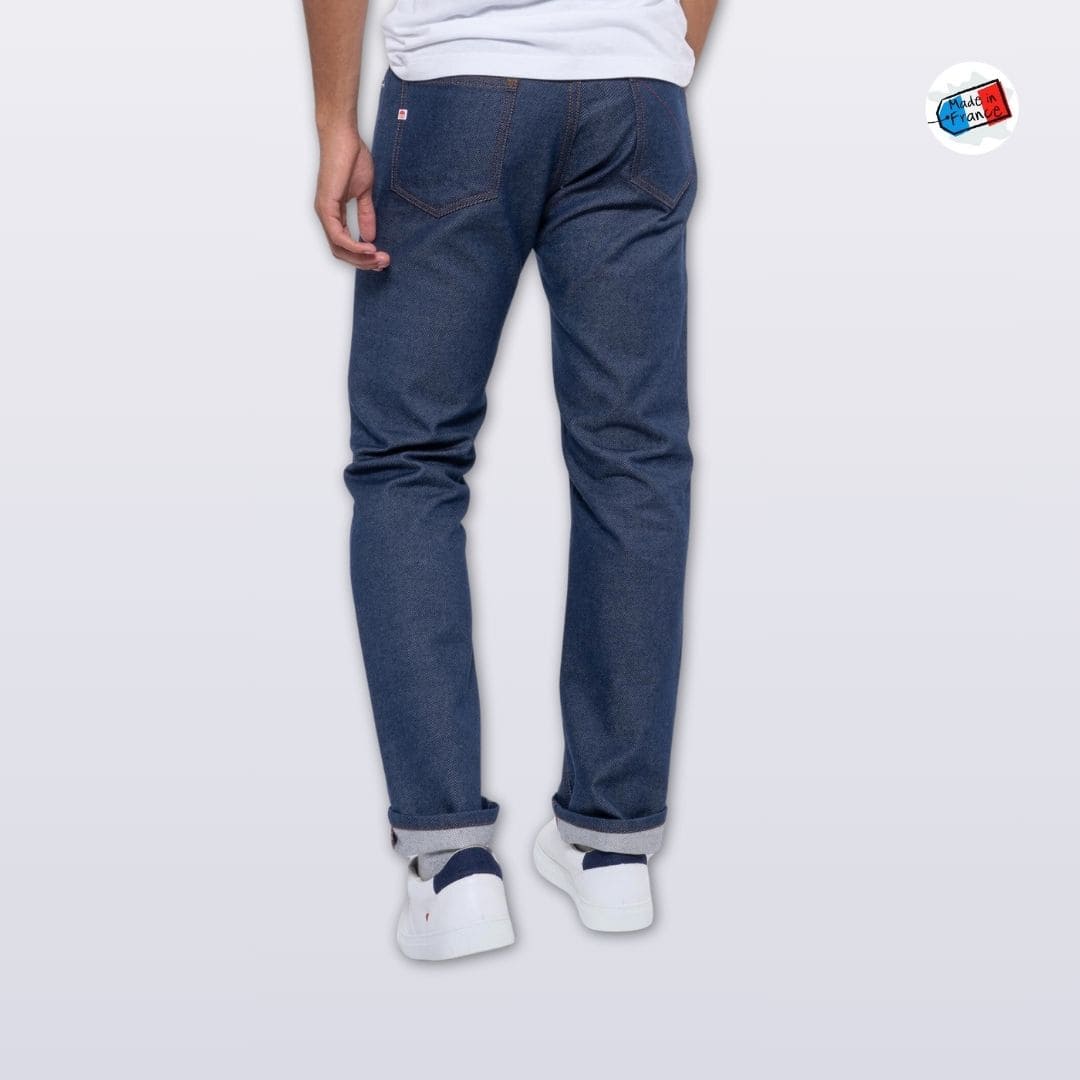 Le jean est entièrement fabriqué en France, de la culture du coton jusqu’à la coupe et la confection finale. Chaque étape, y compris la filature, la teinture, le tissage, l’ennoblissement, la coupe et la confection, est réalisée dans des ateliers situés en France.