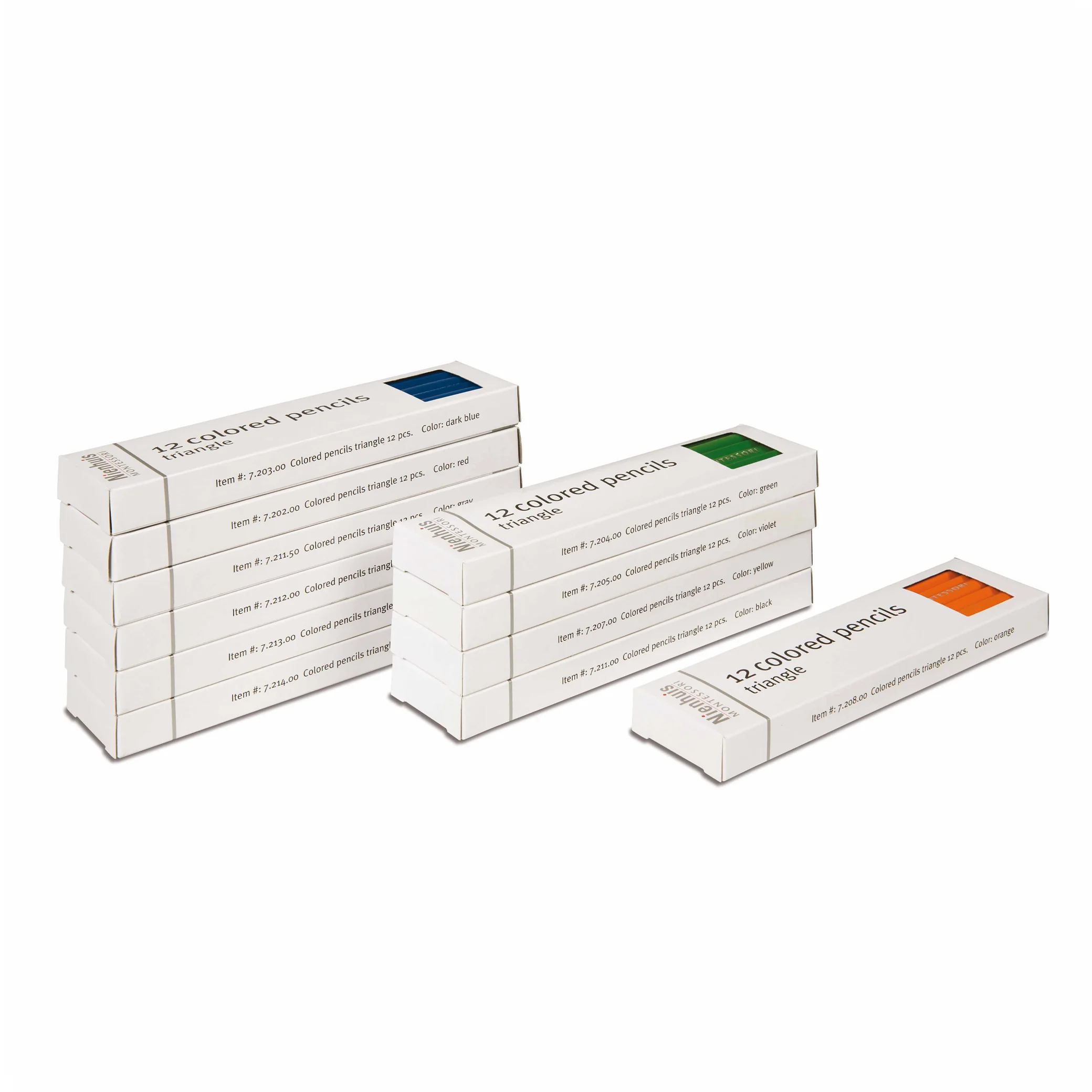 Lot de boites de crayons correspondant aux 11 couleurs (gris-noir-blanc-marron-orange-rouge-rose-vert-jaune-bleu-violet) pour, notamment, l’activité des formes à dessin. Âge : 3-6 ans Zone de la classe : Langage Référence : 720100 Pour tous les produits Nienhuis, la livraison est plus longue (en moyenne 1 à 2 semaines) et dépend des stocks chez le fabricant.