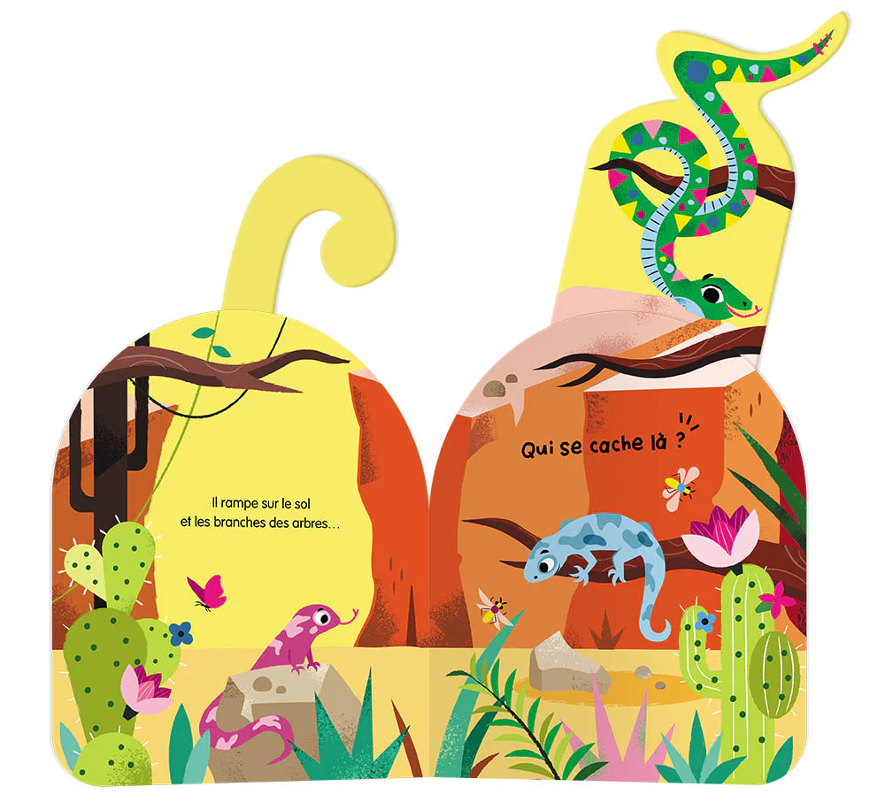 Dans ce jeu de cache-cache, le dernier animal se présente dans une posture rigolote. Il faut tirer sur le haut de sa tête pour découvrir une grenouille stupéfaite… la tête en haut!