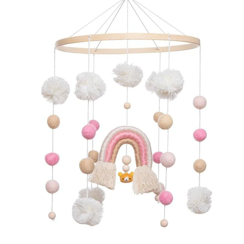 The Baby Bed Rattles Set features wooden rattle, Montessori toys, pacifier chain, doll shape. The Doll Pattern Bed Crib Rattles are more attractive to the baby.