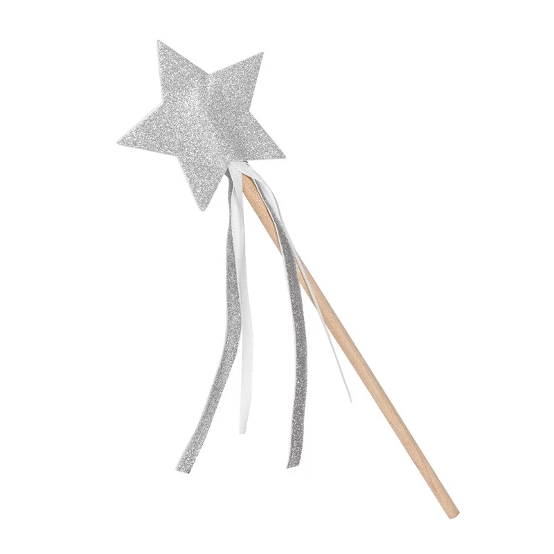 La baguette magique en bois, faite de feutrine et d’un tissu pailleté, elle est dotée de deux rubans pailletés et deux rubans satin.