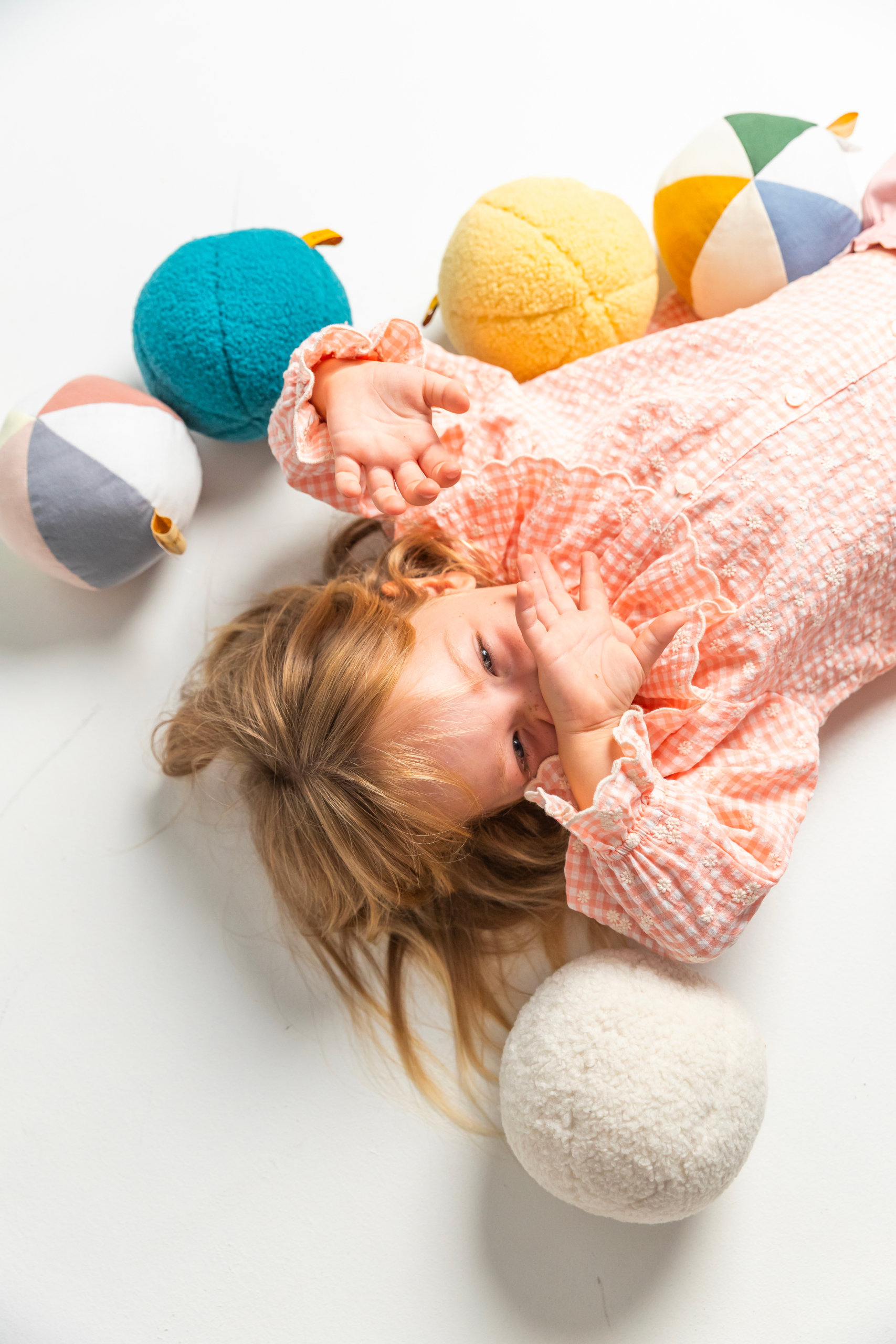 Et pour encore plus de choix, le ballon peluche se décline en 7 couleurs : rose, bleu canard, jaune, lilas, blanc, rouge, bleu et rose pêche.