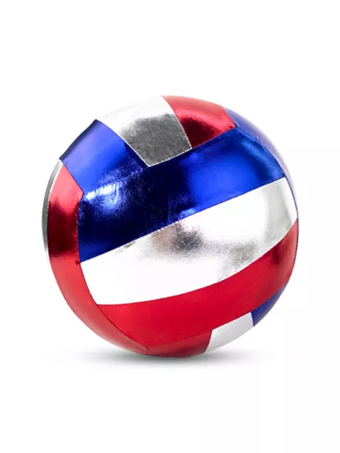 Le ballon en tissus, modèle “volley”, bleu-argent-rouge en diamètre 30 cm est livré dégonflé.