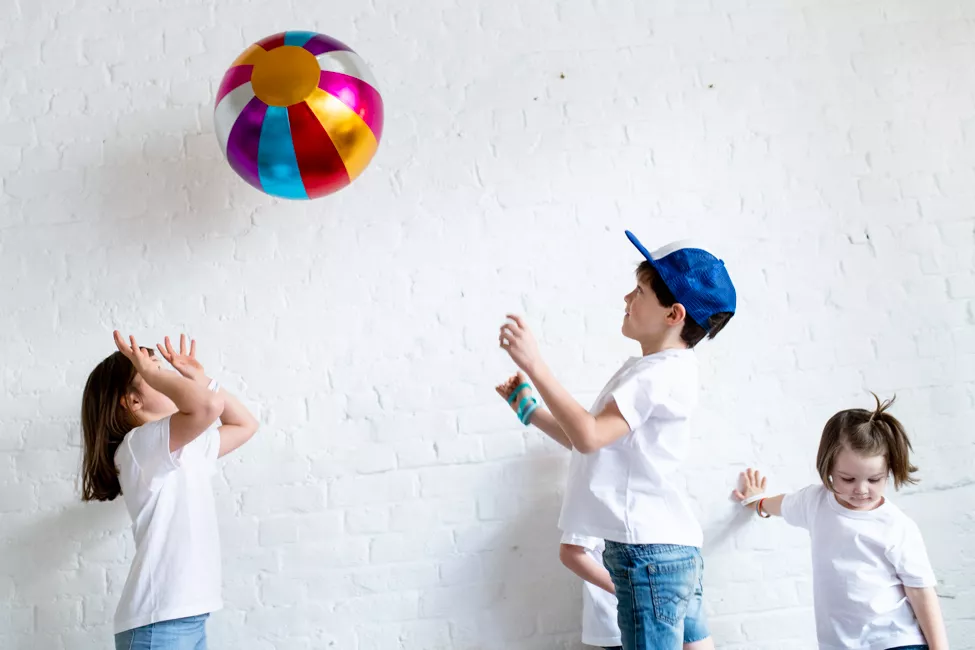 Le ballon en tissus, modèle « volley », bleu-argent-rouge en diamètre 30 cm est livré dégonflé.