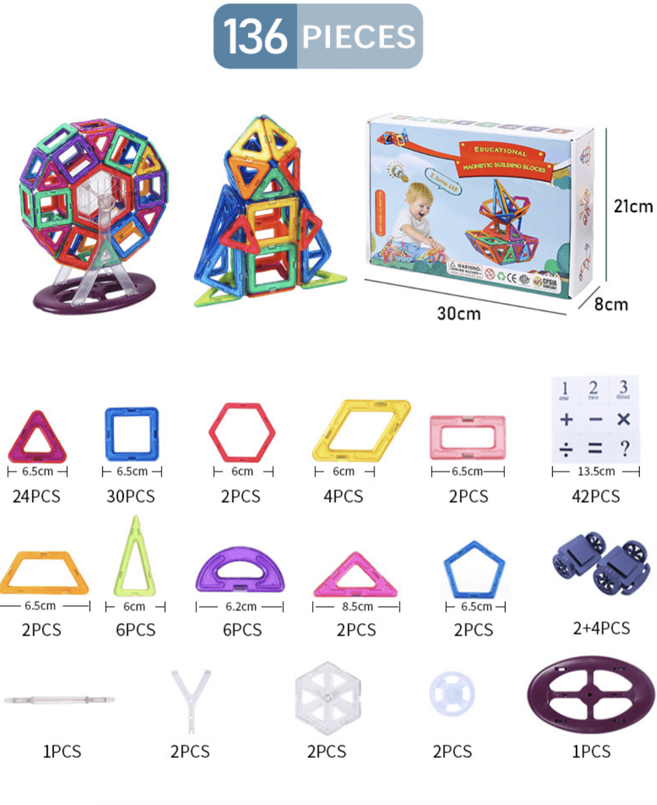 - 30 pièces carrées, 24 triangles équilatéraux, 2 hexagones, 42 ensembles de chiffres et signes de calcul, 4 roues, 2 chassis, 1 base, 2 vis, 2 supports, 1 tige, 1 manuel et plusieurs autres formes.