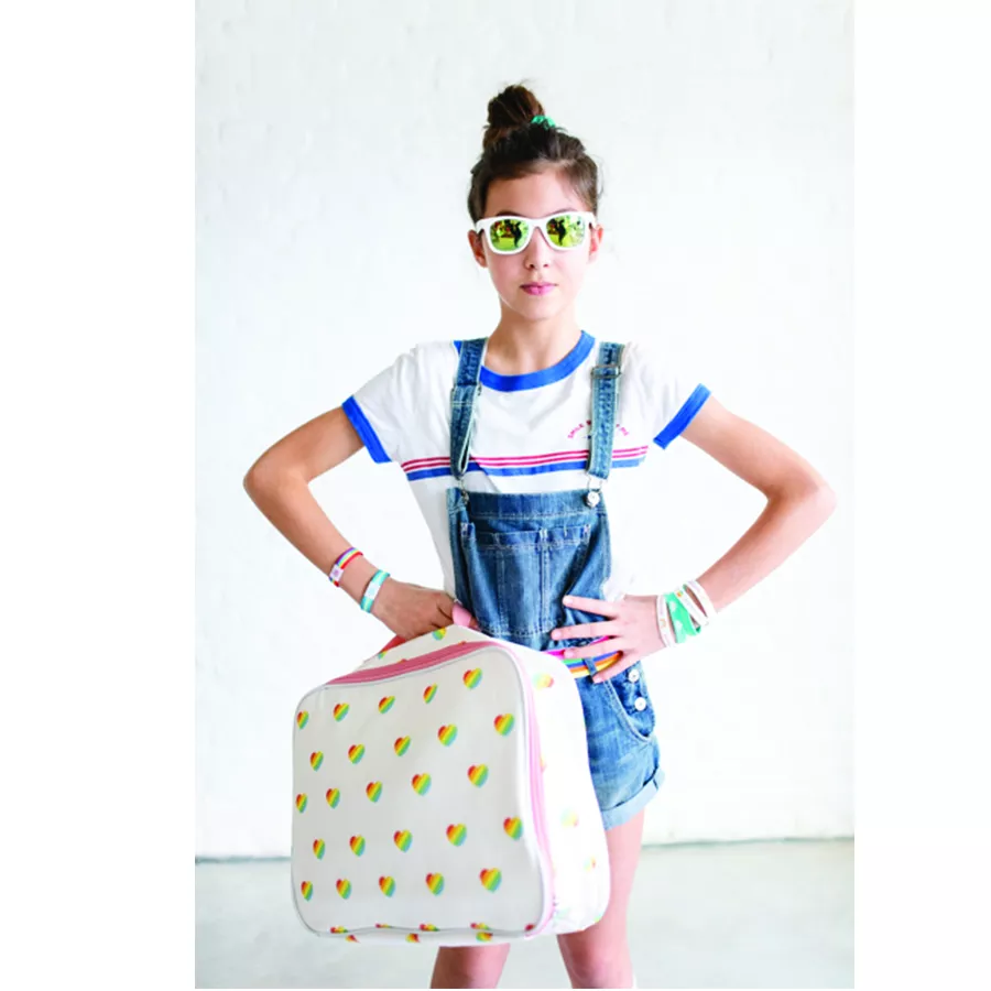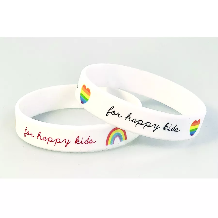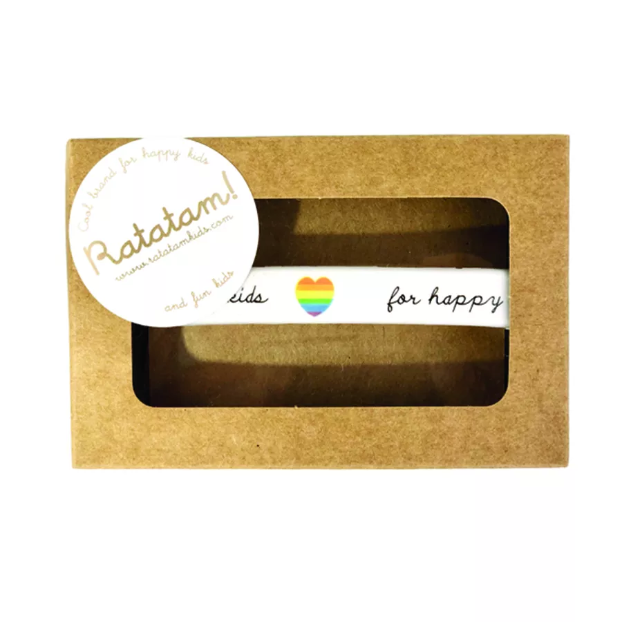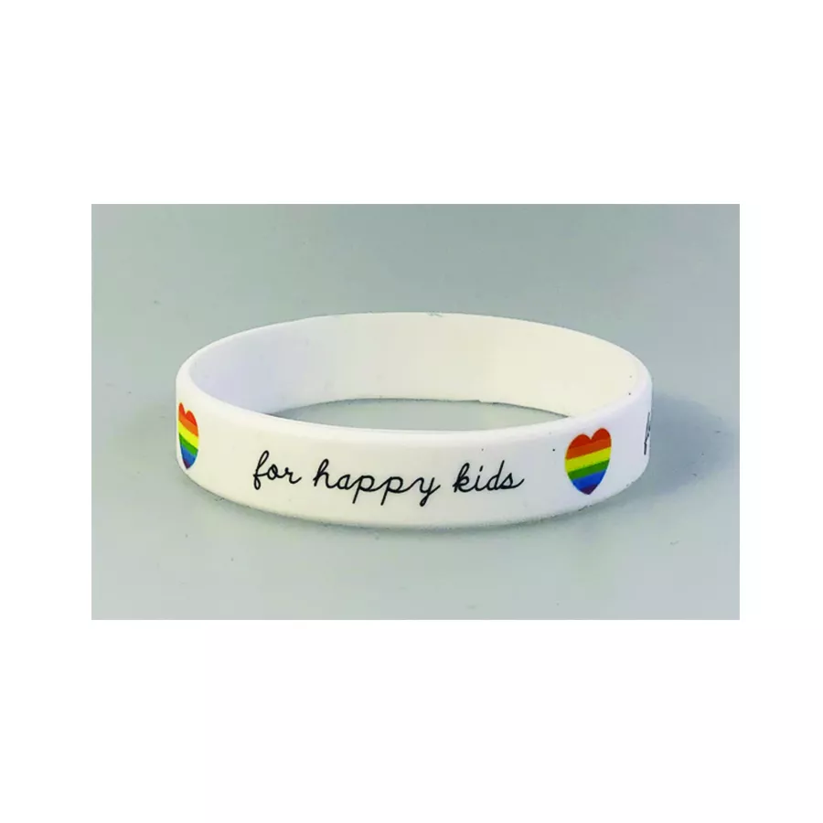 Bracelet en silicone coeur multicolore, taille enfant. Bracelet blanc à motif arc en ciel multicolore. Le petit bracelet en silicone, top pour l’été même pas besoin de l’enlever avant d’aller se baigner!