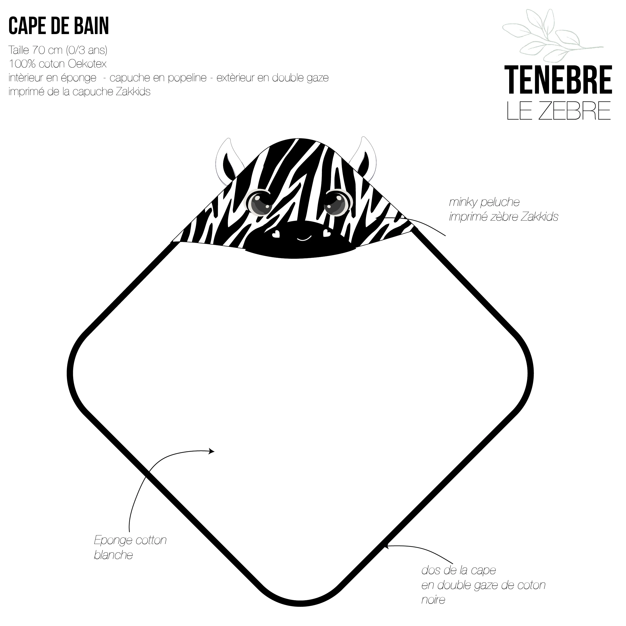 🚿 Pratique pour la sortie du bain dès la naissance, la serviette de bain Zakkids se compose d’une jolie cape bébé avec capuche intégrée à motif zèbre, entièrement doublée de double gaze de coton Oekotex. Réalisée dans une éponge Oekotex très douce et absorbante.