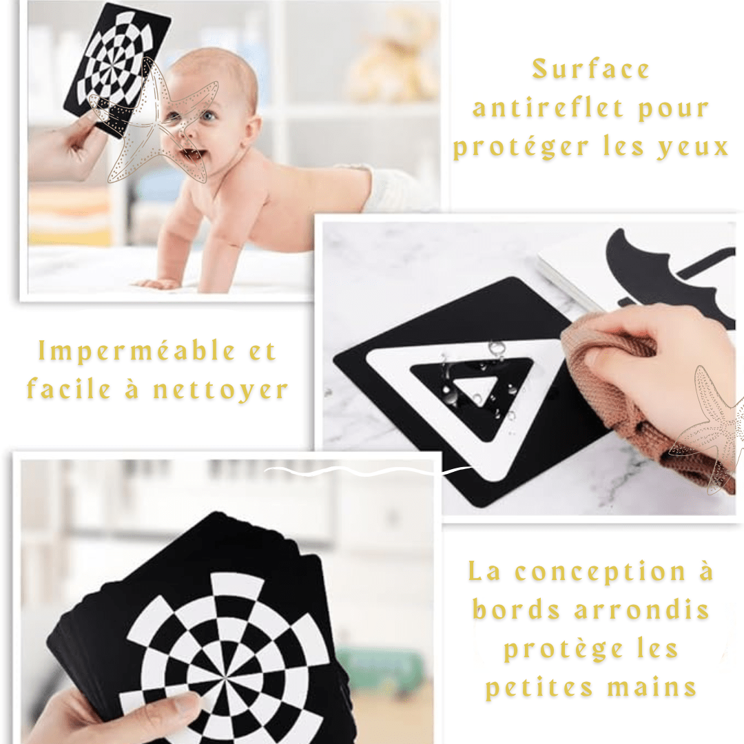 Avec leurs contrastes forts en noir et blanc, ces cartes permettent aux bébés :