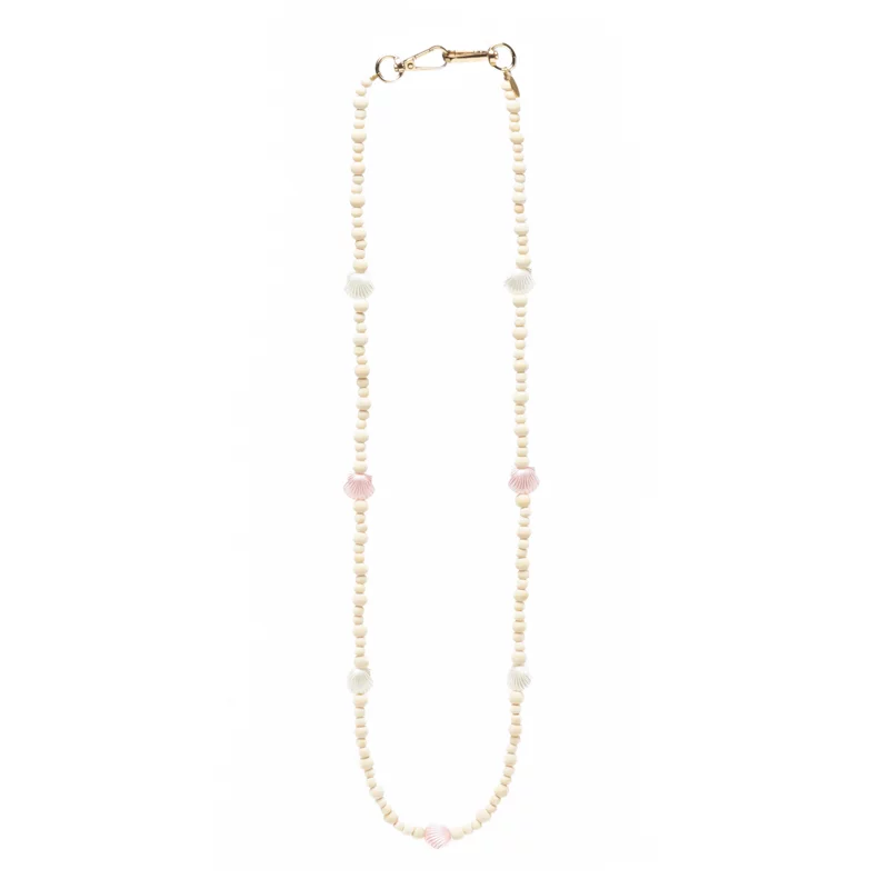 Commandez dès maintenant et ajoutez une touche de fun et de style à votre quotidien avec notre chaîne de téléphone en bois avec perles fantaisies corail et blanches ! 🌴📱✨