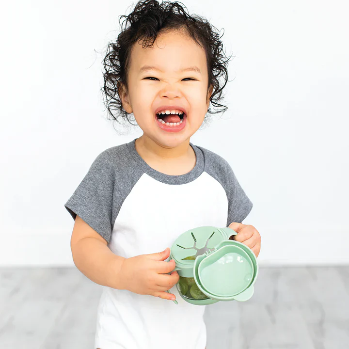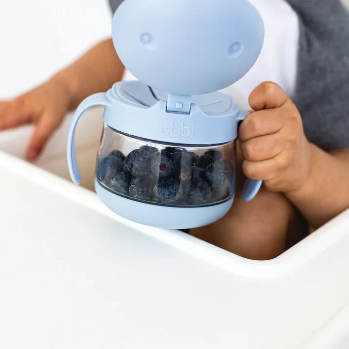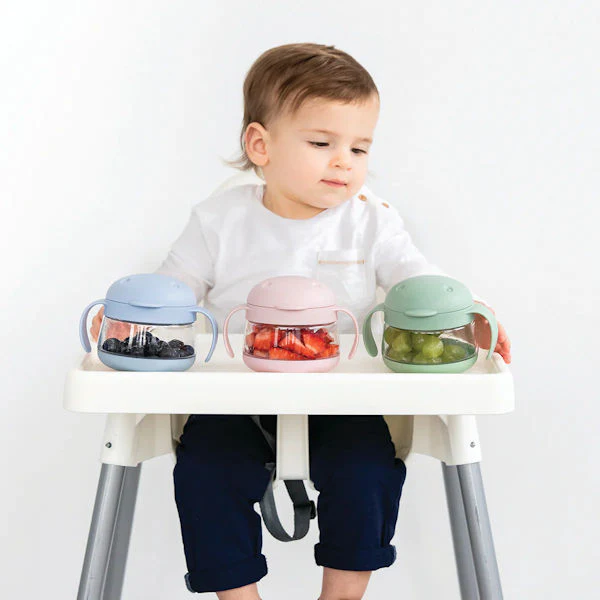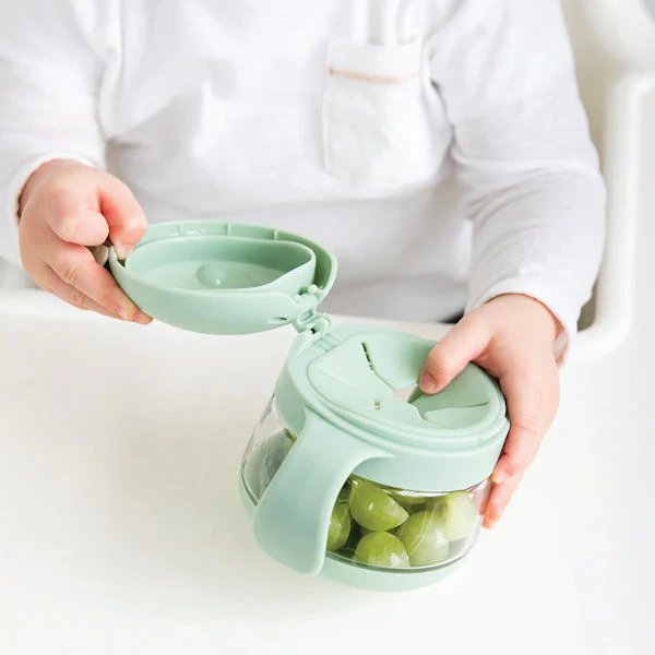 L’ouverture en caoutchouc avec couvercle est conçue pour garder les aliments dans le contenant jusqu’à ce que ce soit le moment de les manger. Les petites mains peuvent facilement accéder aux aliments sans dégâts.