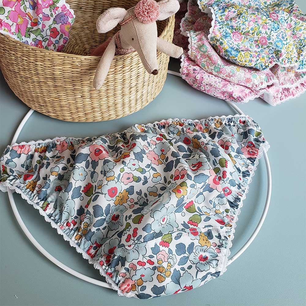 Une culotte en tissu Liberty cousue avec soin dans l’atelier d’Astrid à Choezau en Isère.