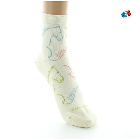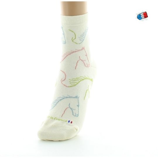 Ajoutez une touche d’originalité à votre tenue avec nos chaussettes courtes femme en coton biologique, ornées de motifs chevaux pastels. Confortables et durables, elles sont tricotées en France et respectent l’environnement.