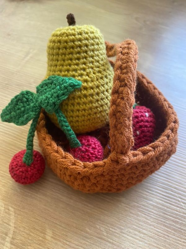 Vous trouverez dans le petit panier : une poire, des cerises et une jolie fraise ! (les éléments peuvent être vendus séparément sur demande à [email protected]).