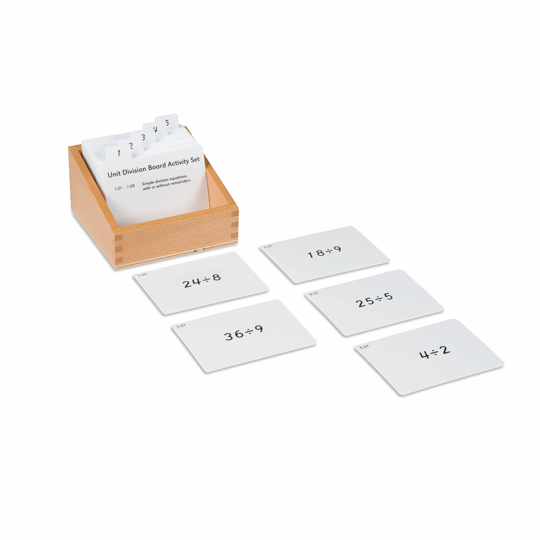 Exercices supplémentaires à utiliser avec le tableau de division des unités. Comprend : des fiches d’exercices, des onglets de séparation et une boîte en bois pour le rangement.