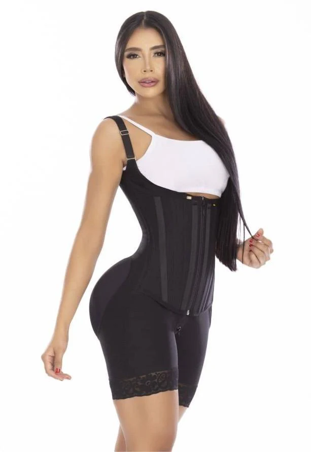 La gaine ceinture sablier avec bretelles, mi-Cuisse, double réglage et ouverture à l’entraînement est un vêtement conçu pour modeler et mettre en valeur la silhouette féminine avec un niveau de compression élevé.