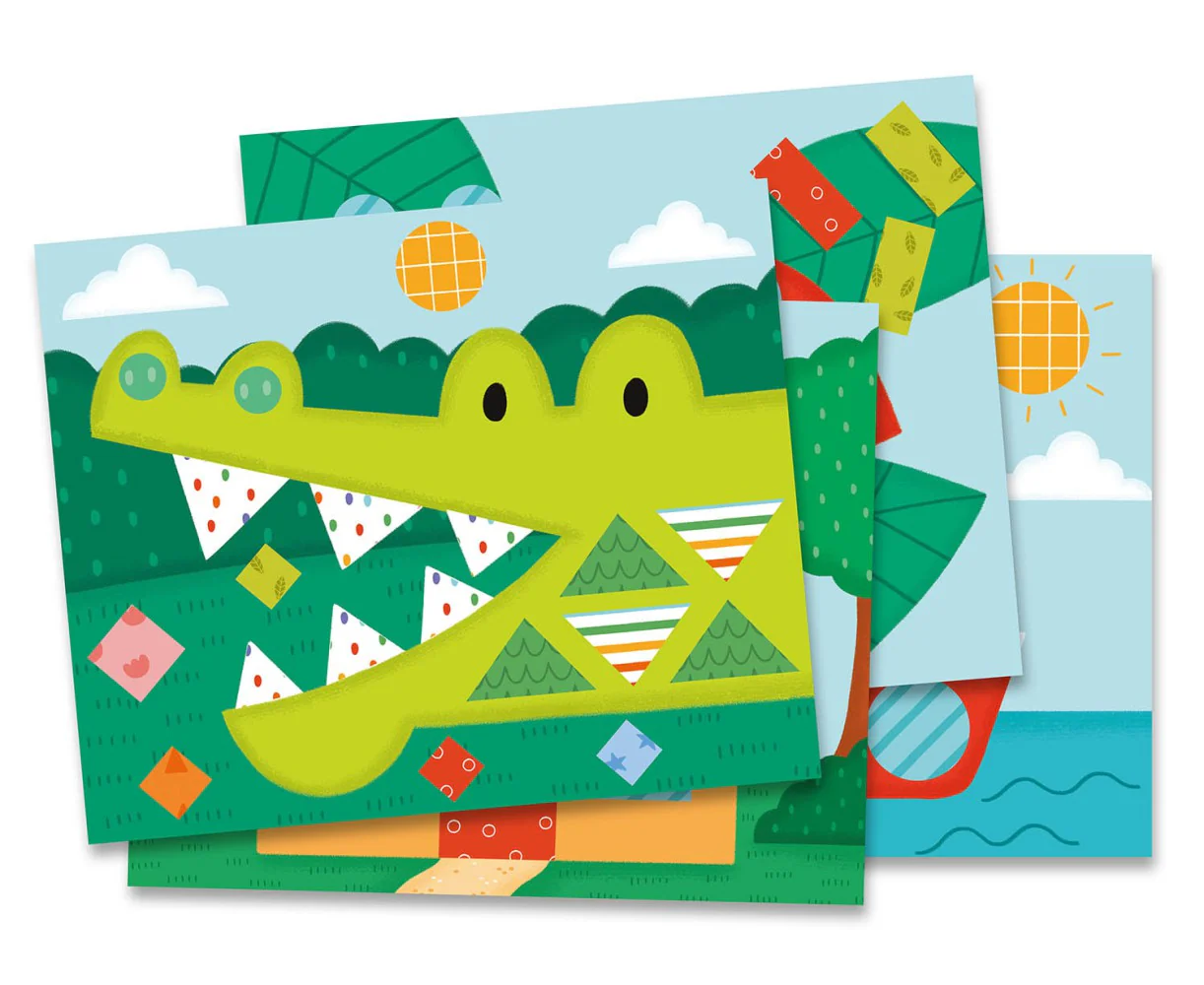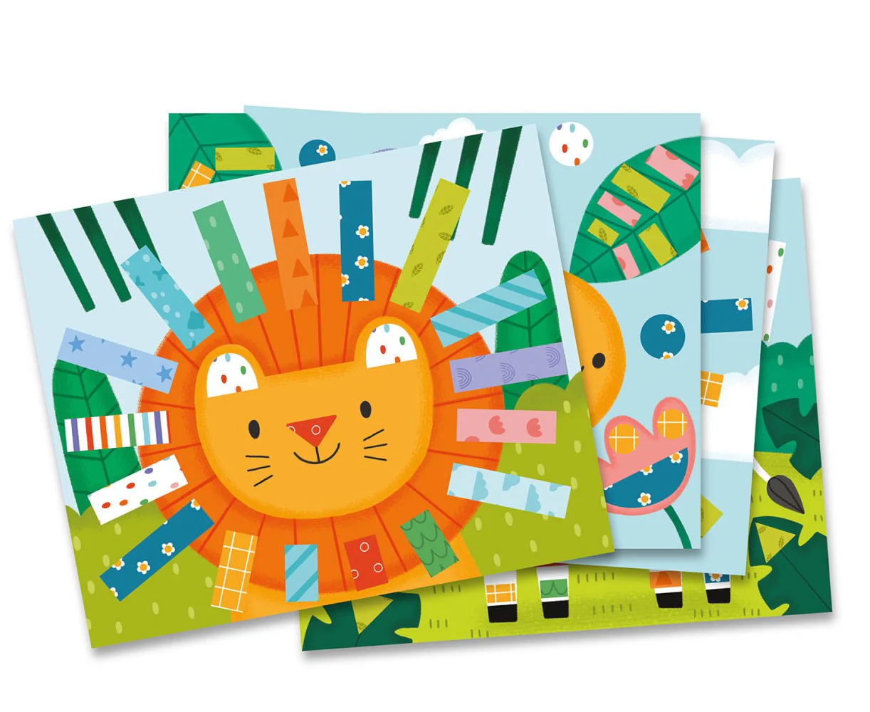 8 adorables tableaux à décorer, et 2 niveaux de difficulté pour s’adapter aux petites mains, et aux mains plus expertes.15 feuilles de motifs à découper et à coller pour habiller les décors. Des modèles sont fournis pour aider l’enfant à réaliser l’activité.La paire de ciseaux adaptées aux petites mains en forme de tigre permettra à l’enfant à découper sans se faire mal !