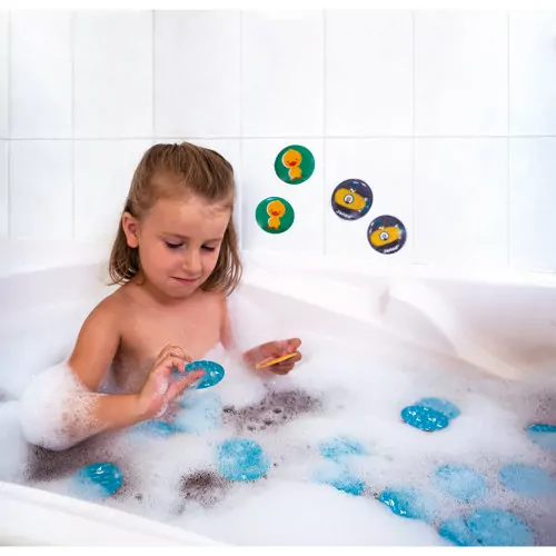 Jeu de mémo rigolo pour jouer dans le bain! 24 cartes en mousse qui flottent et qui tiennent sur le contour du bain une fois mouillées. Prêts pour une petite partie? Un jeu qui développera la dextérité et la mémoire de votre enfant. Âge recommandé:2-4 ans Taille des pièces:6.5cm de diamètre