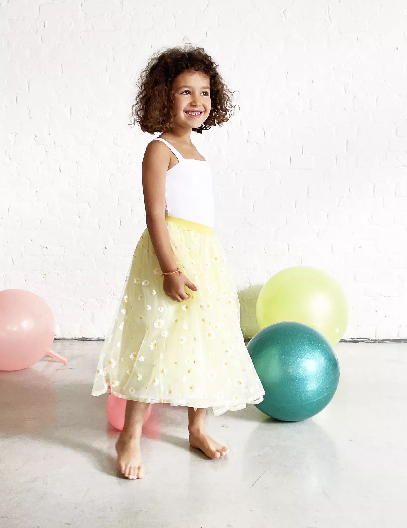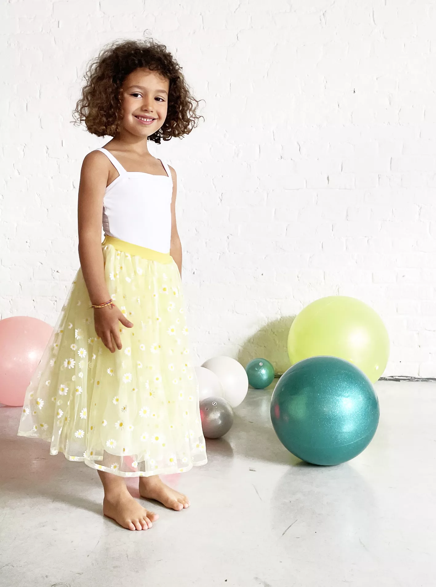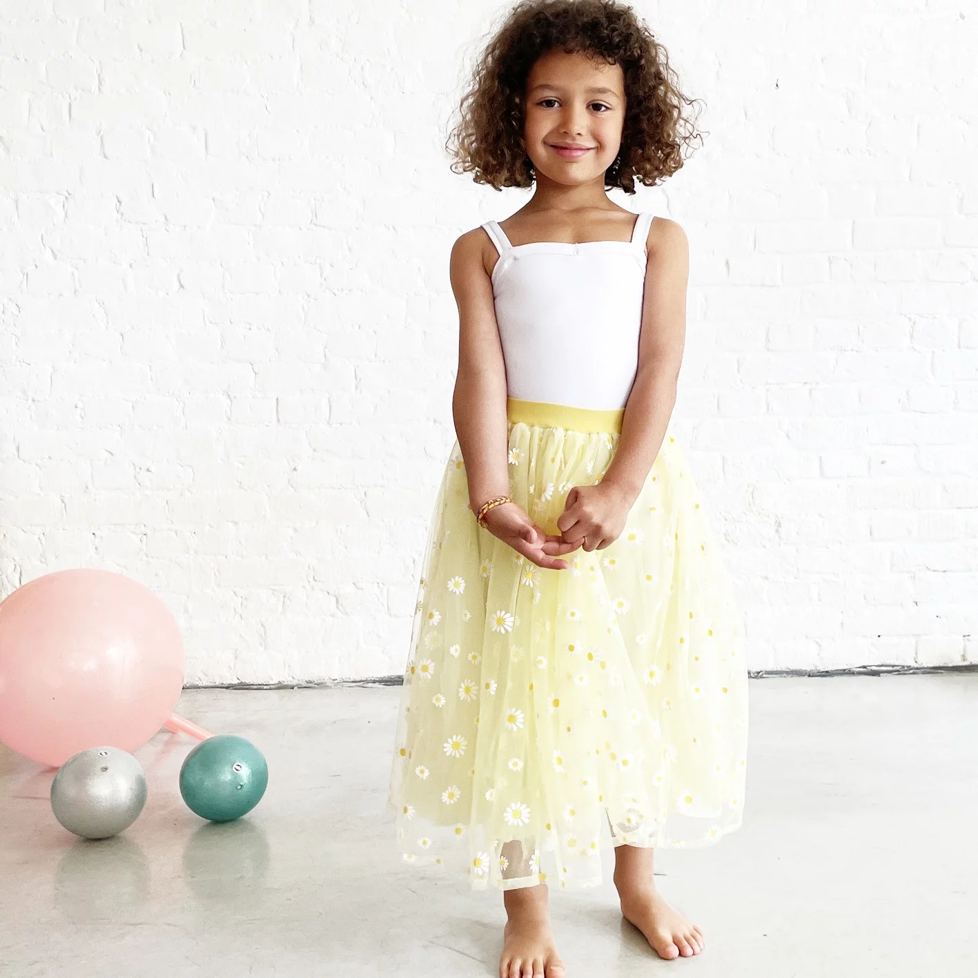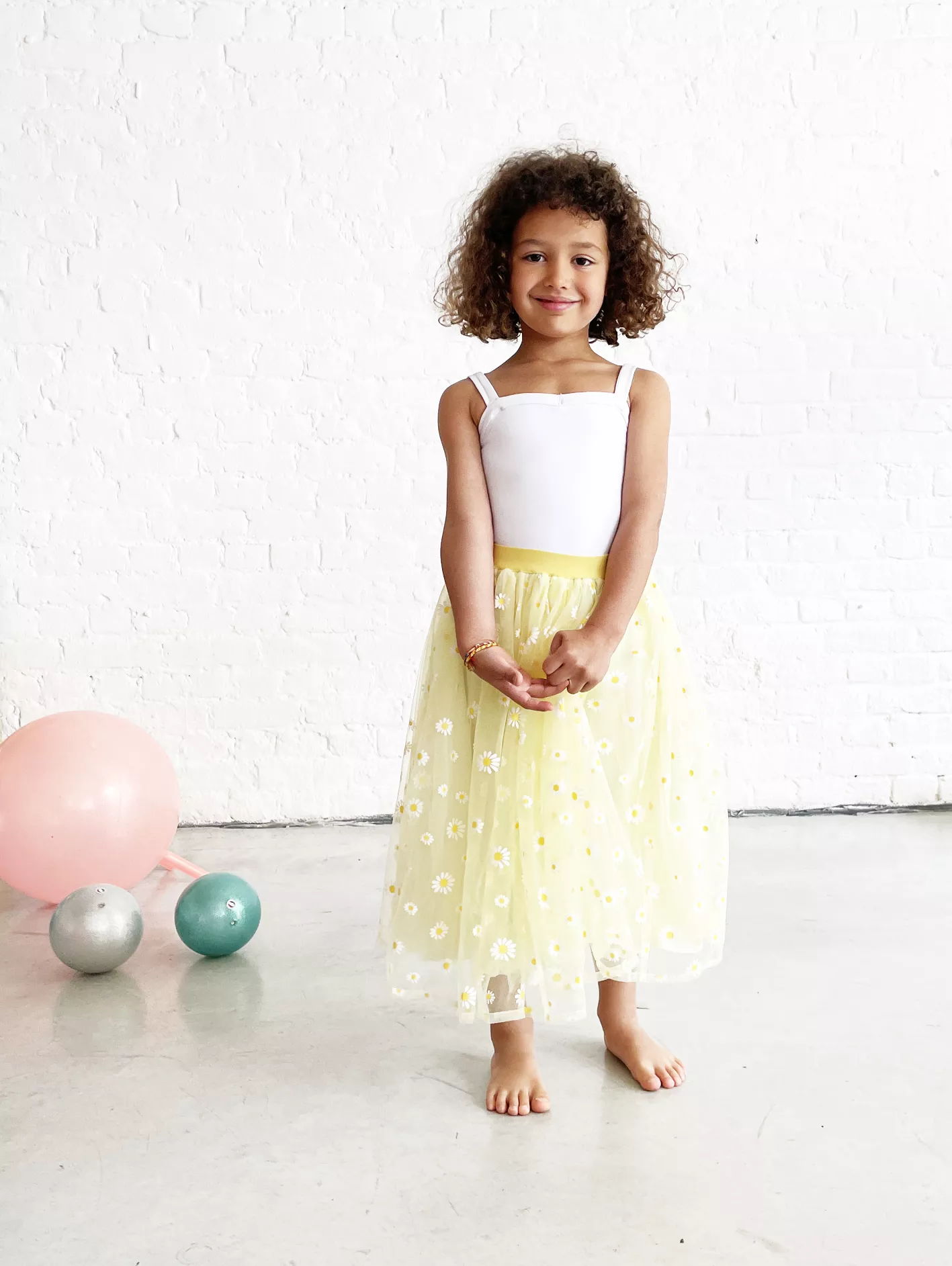 Le jupon long marguerite tout fleuri, il parait que ces petites fleurs blanches et jaunes colorent la vie!! Youpi! Taille élastiquée pailletée. Taille unique.