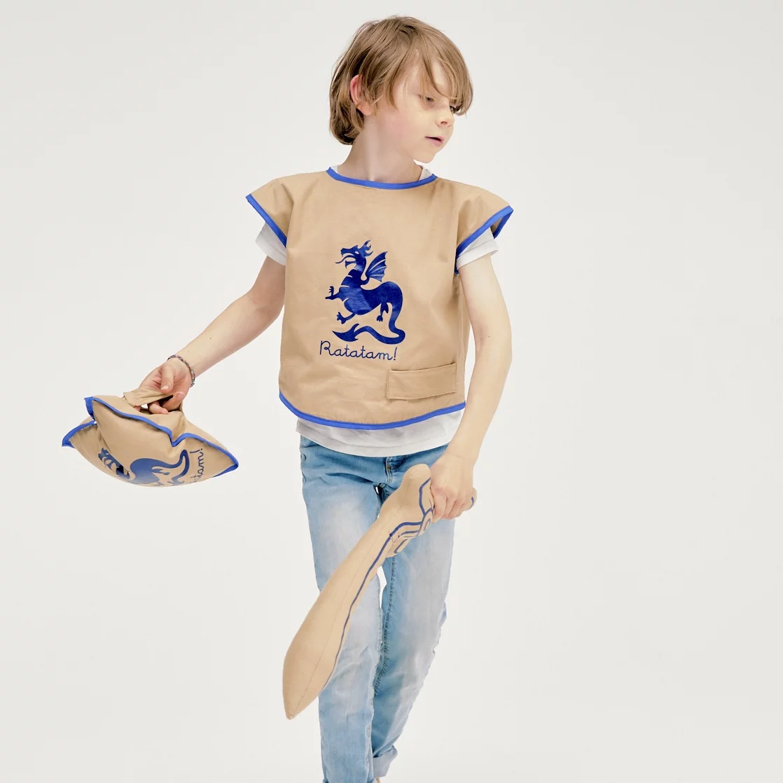 Ce set de courageux chevalier en 100 % coton, est composé de 3 éléments : une chasuble avec fourreau intégré pour y ranger son épée, une épée et un bouclier.