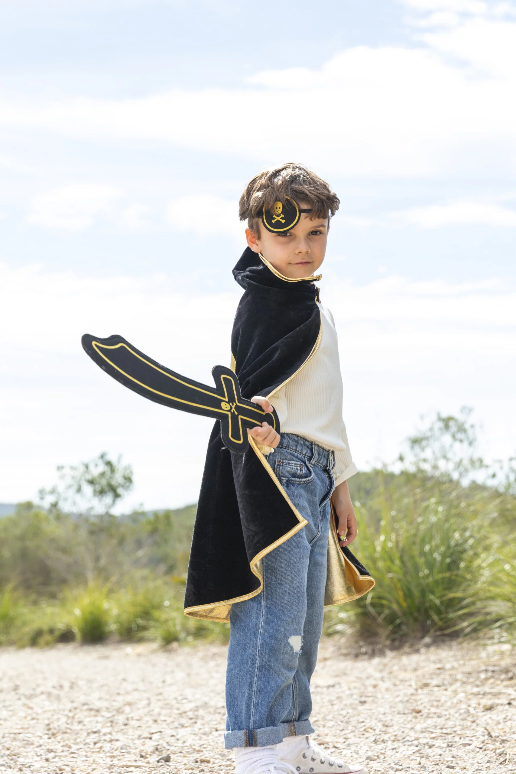 A l’abordage moussaillon ! Tremblez, marins d’eau douce! Les pirates débarquent ! Le top du top : le kit complet du vrai corsaire est composé: d’une cape + un sabre + un cache-œil ! On est d’accord, c’est un indémodable de la malle à déguisements, nan?