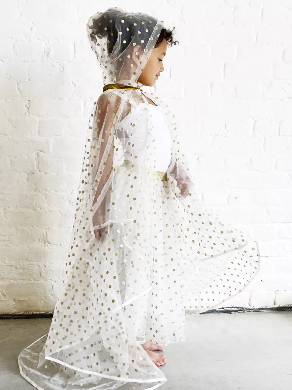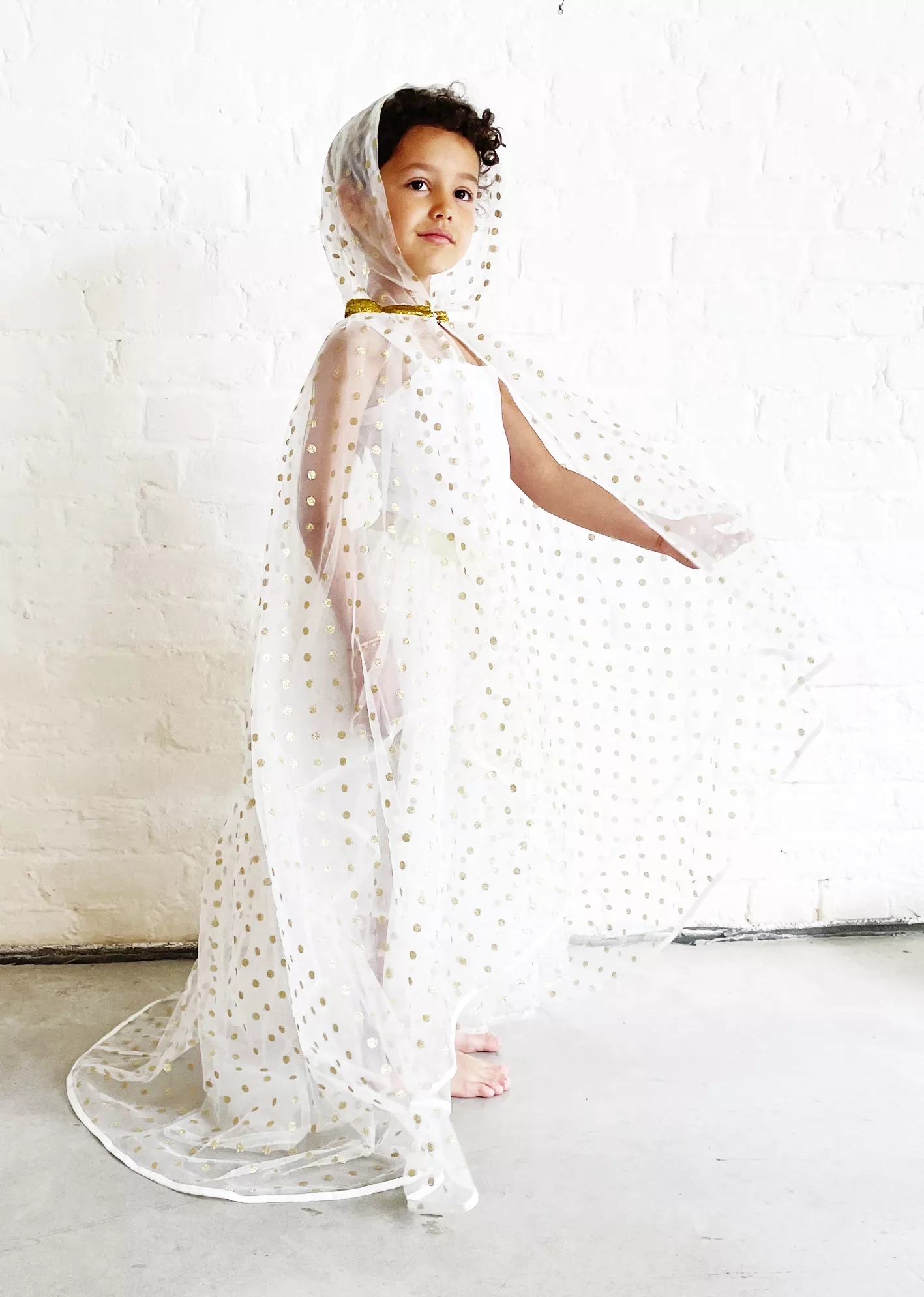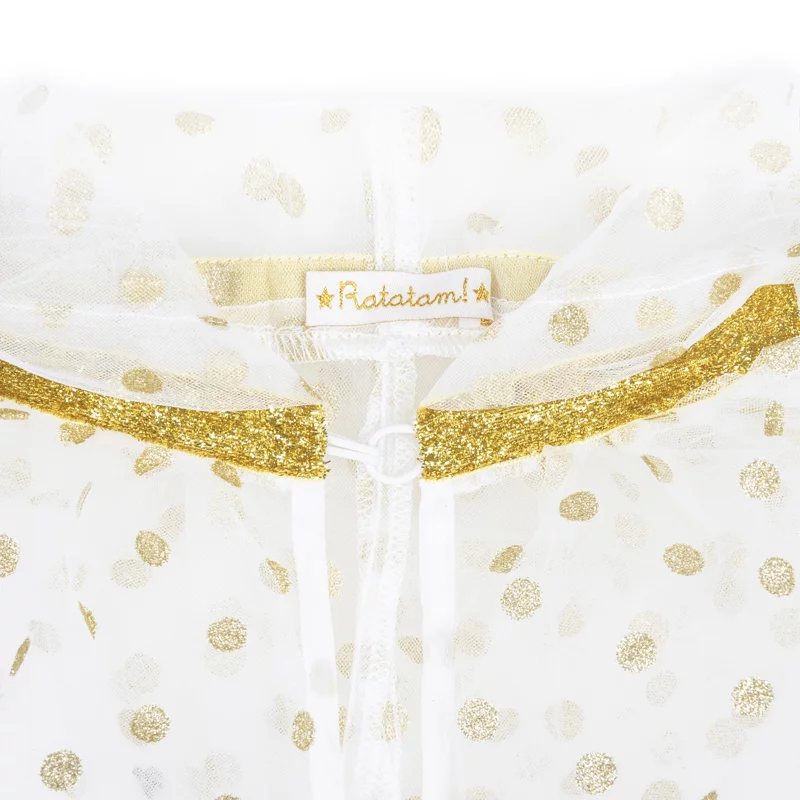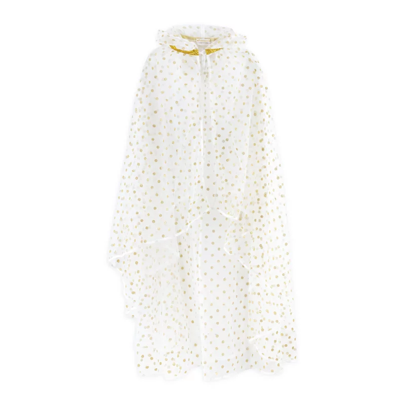 La cape de fée avec capuche. La cape de fée, de princesse, d’elfe, de magicienne…. La cape de déguisement couleur crème à pois doré avec capuche. Elle se noue au cou grâce à un système d’accroche.