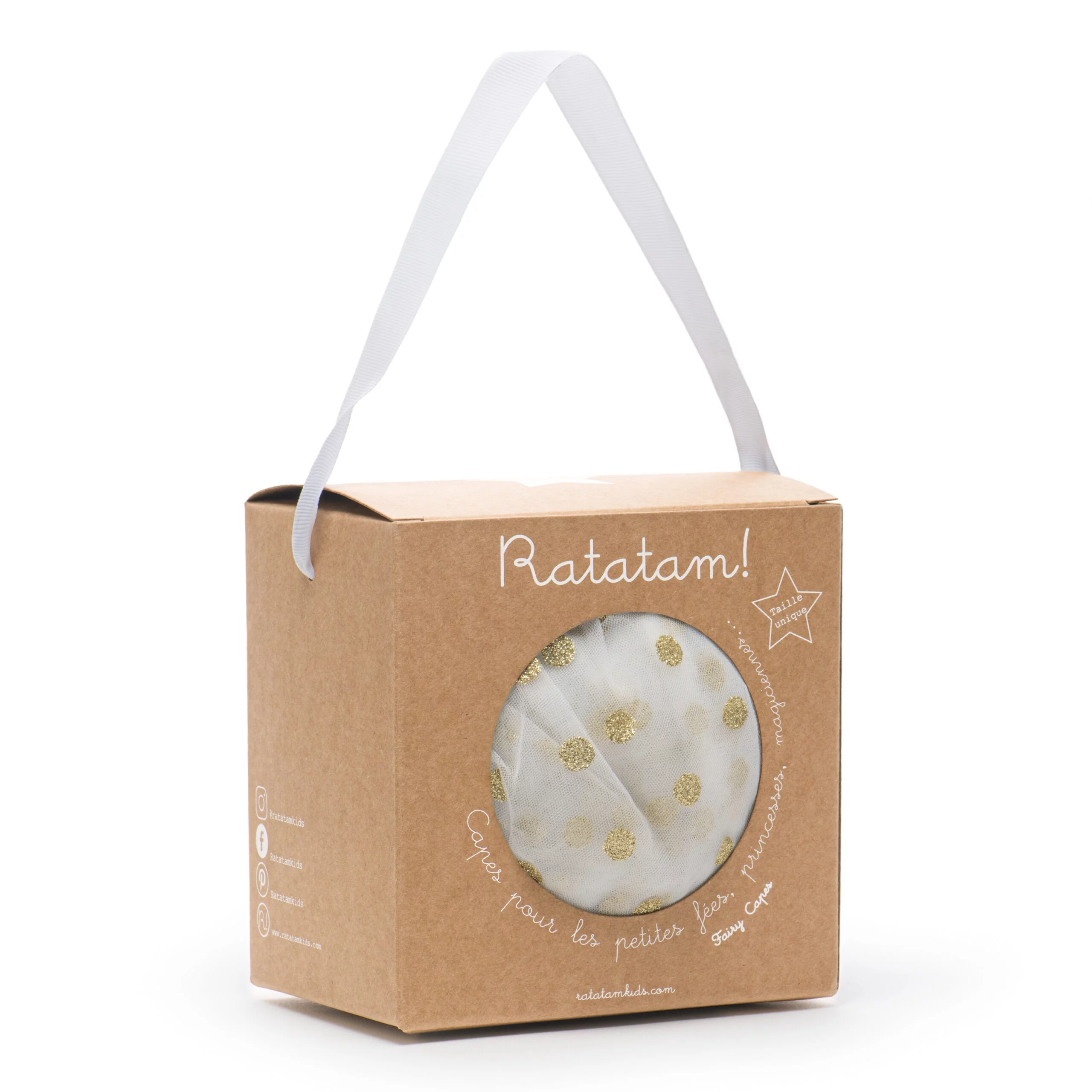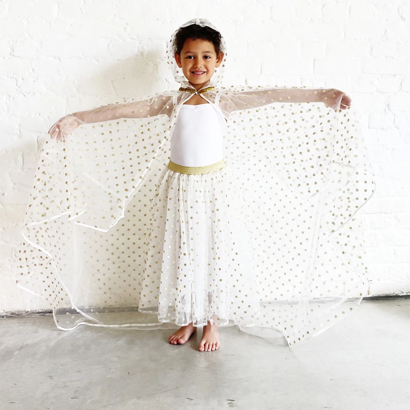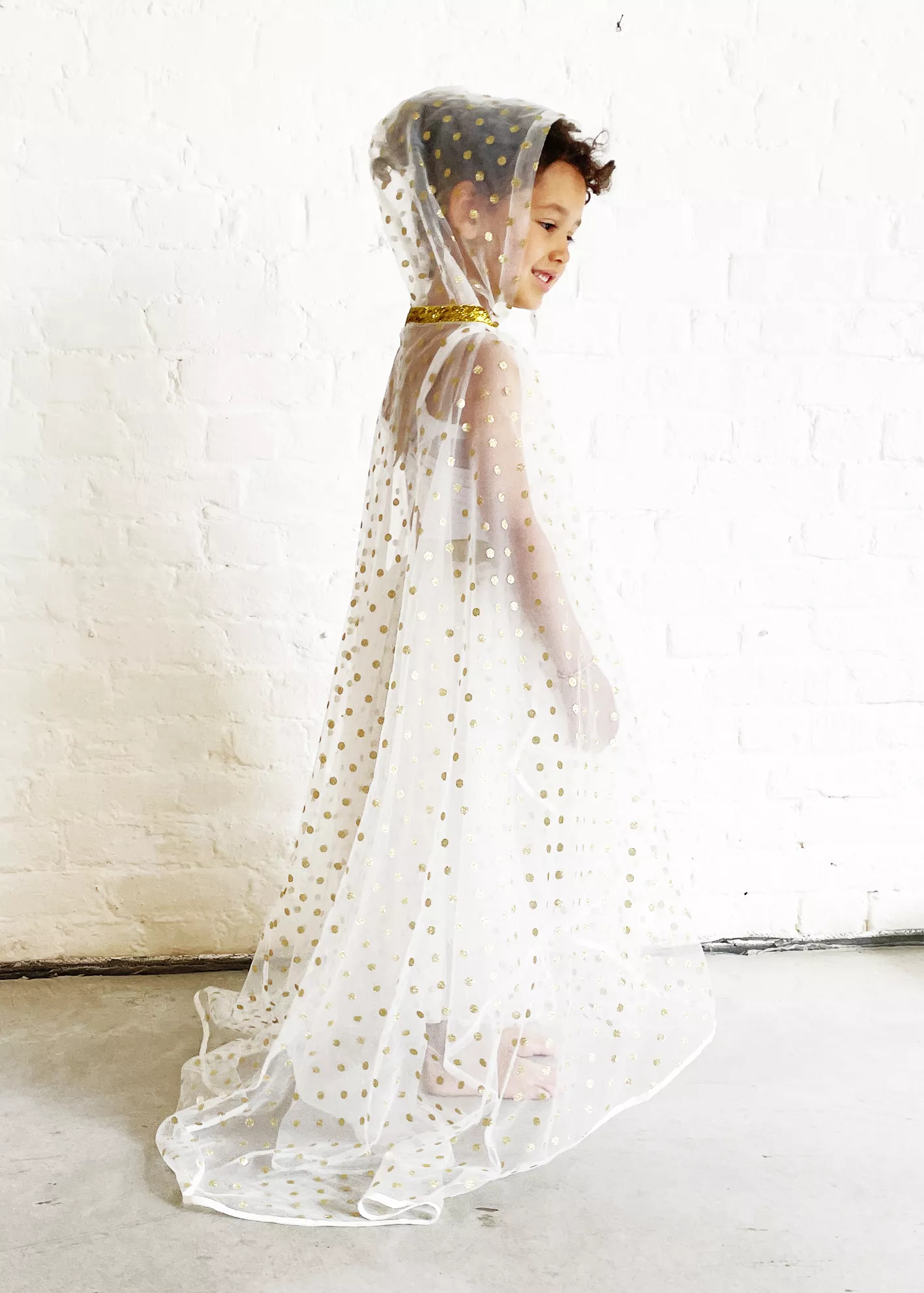 La cape de fée avec capuche. La cape de fée, de princesse, d’elfe, de magicienne…. La cape de déguisement couleur crème à pois doré avec capuche. Elle se noue au cou grâce à un système d’accroche.