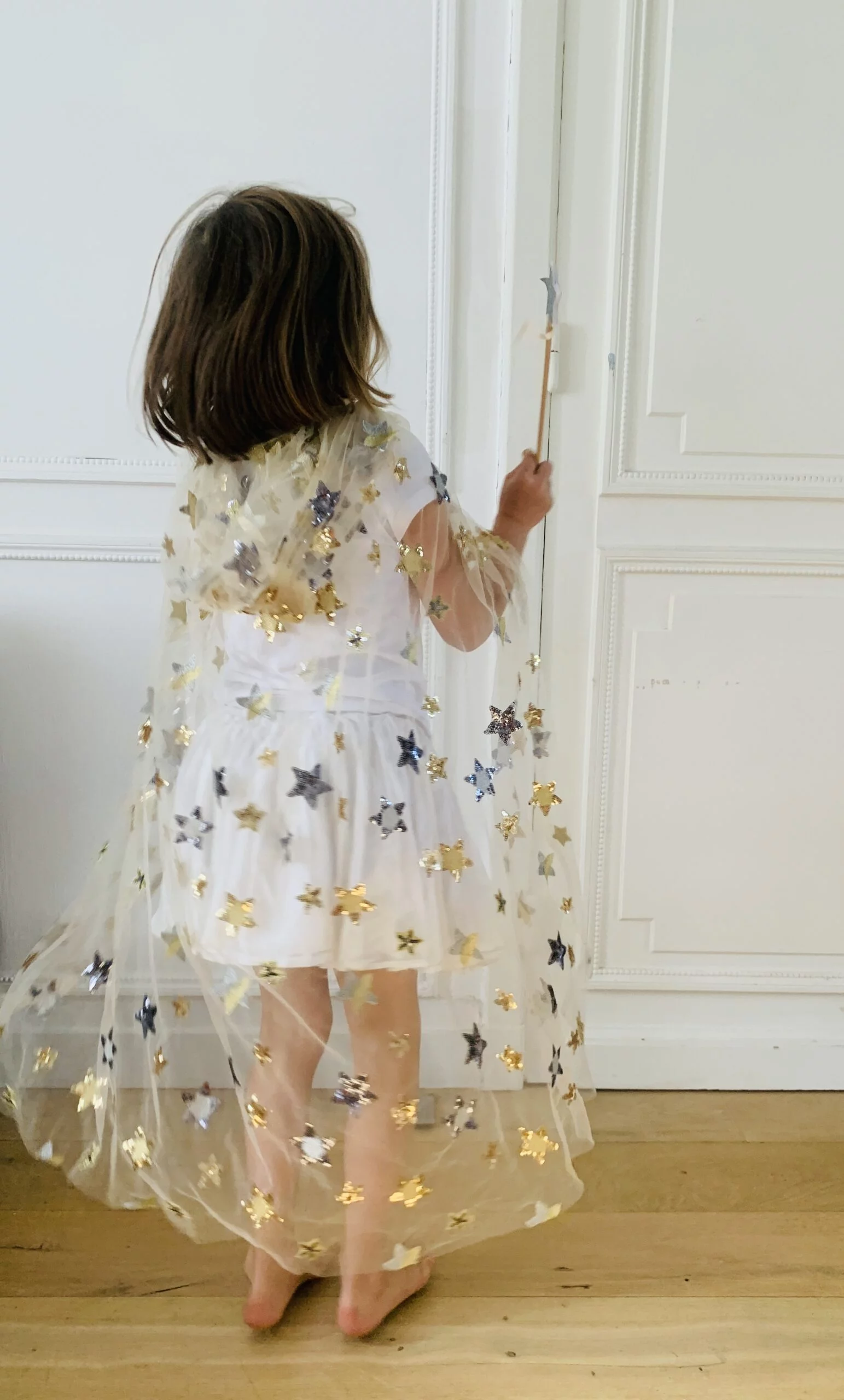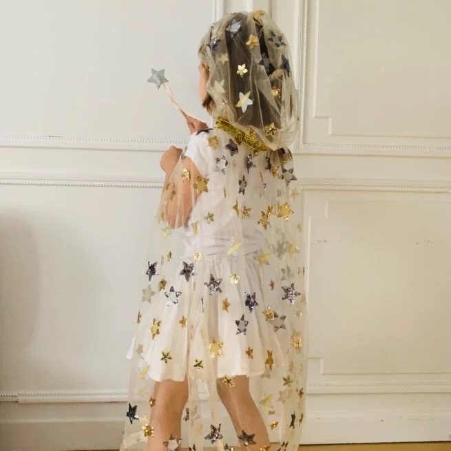 La cape de fée, de princesse, d’elfe, de magicienne…. L’élément indispensable dans la malle à déguisement! La cape de fée à capuche est en tule, elle est brodée de fil argent et de sequins dorés et argentés. Elle se noue au cou grâce à un système d’accroches.