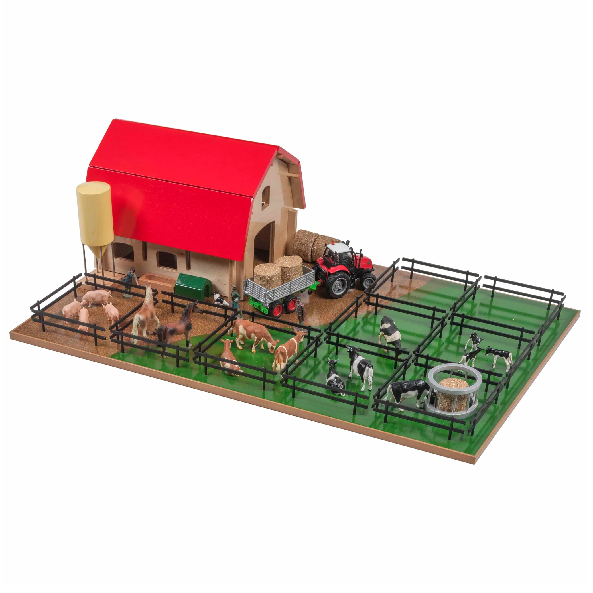On y trouve : une ferme, des gens, des animaux, des clôtures et une base de travail.