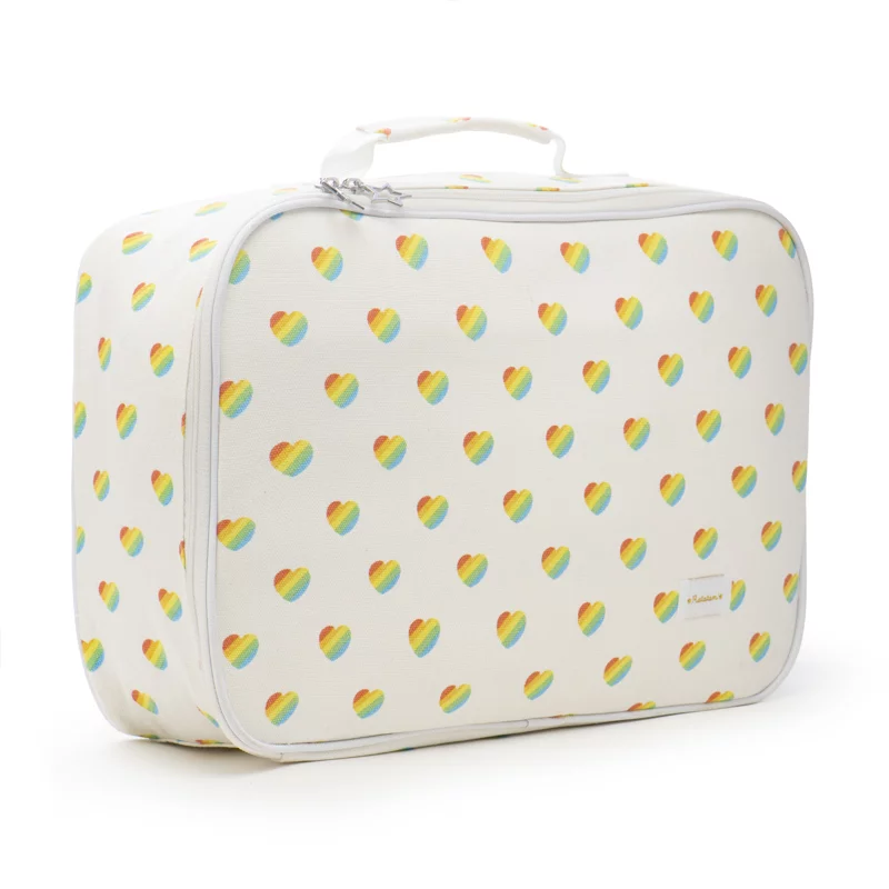 🌈✨ Préparez-vous pour une escapade pleine de couleurs avec notre adorable valise week-end rétro imprimée de cœurs arc-en-ciel ! ✨🌈