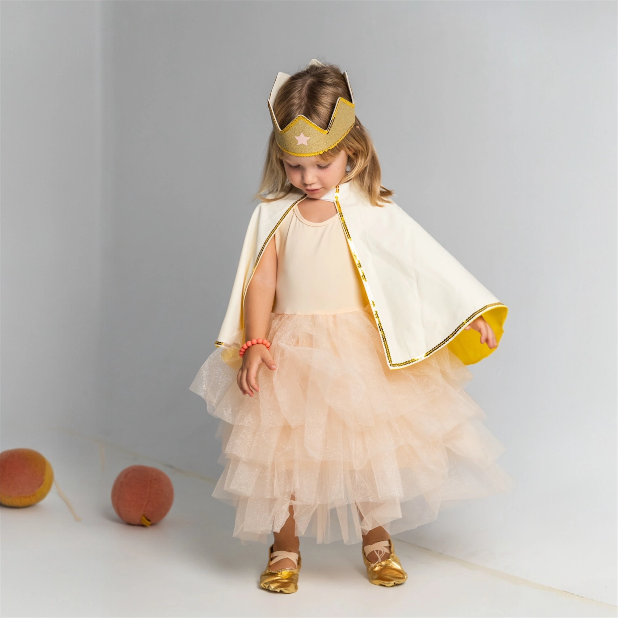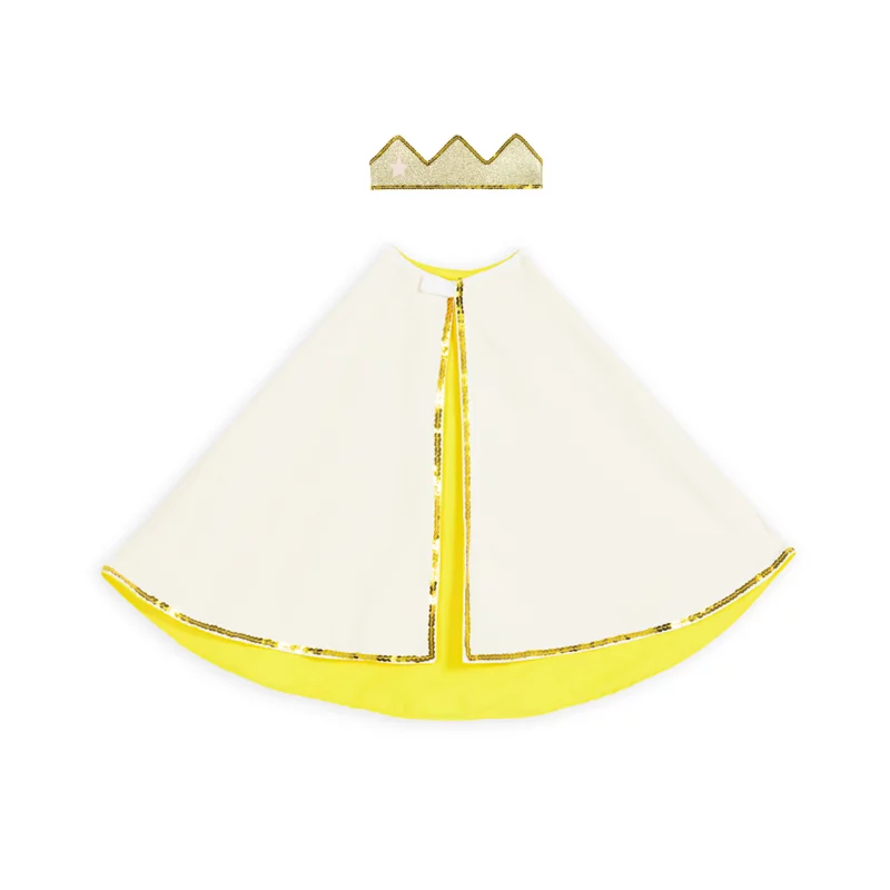 La cape dorée et la couronne assortie offrent un style digne des plus grands royaumes imaginaires. L’étoile scintillante apporte ce petit détail magique qui fait toute la différence.