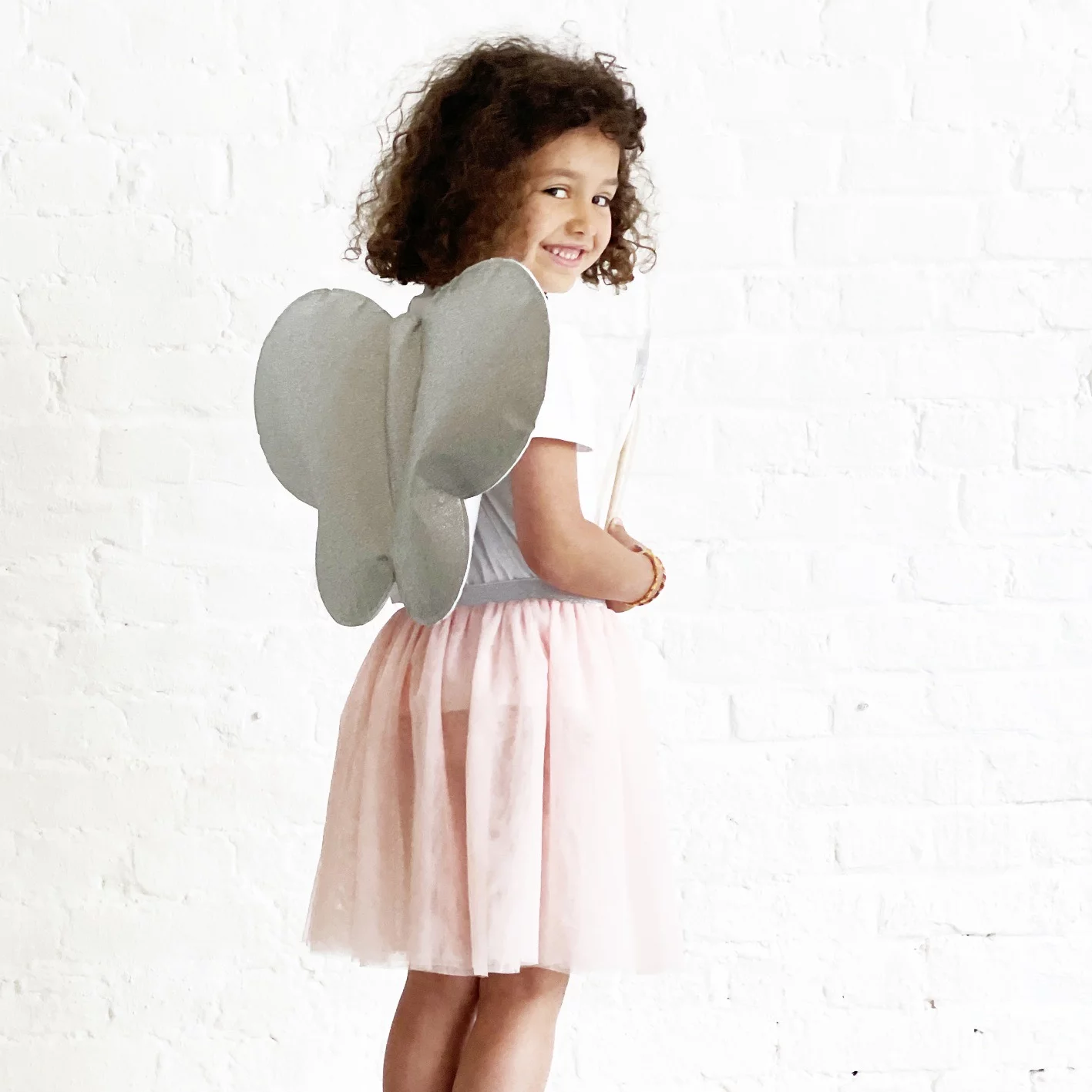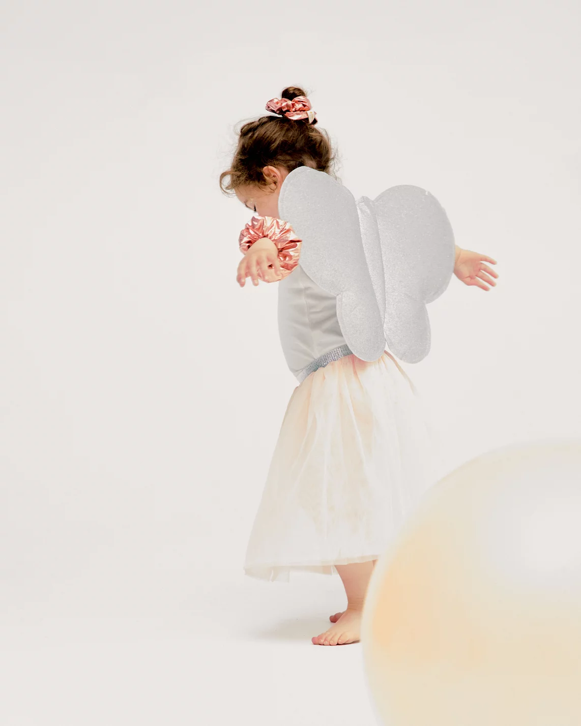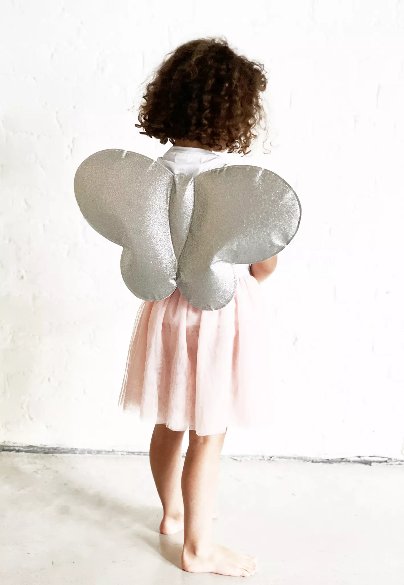 - Et enfin, les ailes de papillon pailletées argentées ! Elles sont attachées avec des bretelles élastiques pour que tu puisses les mettre facilement et te sentir libre comme l’air !