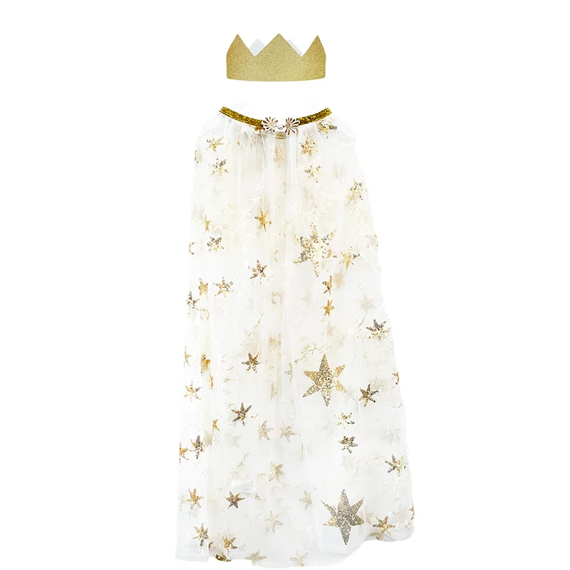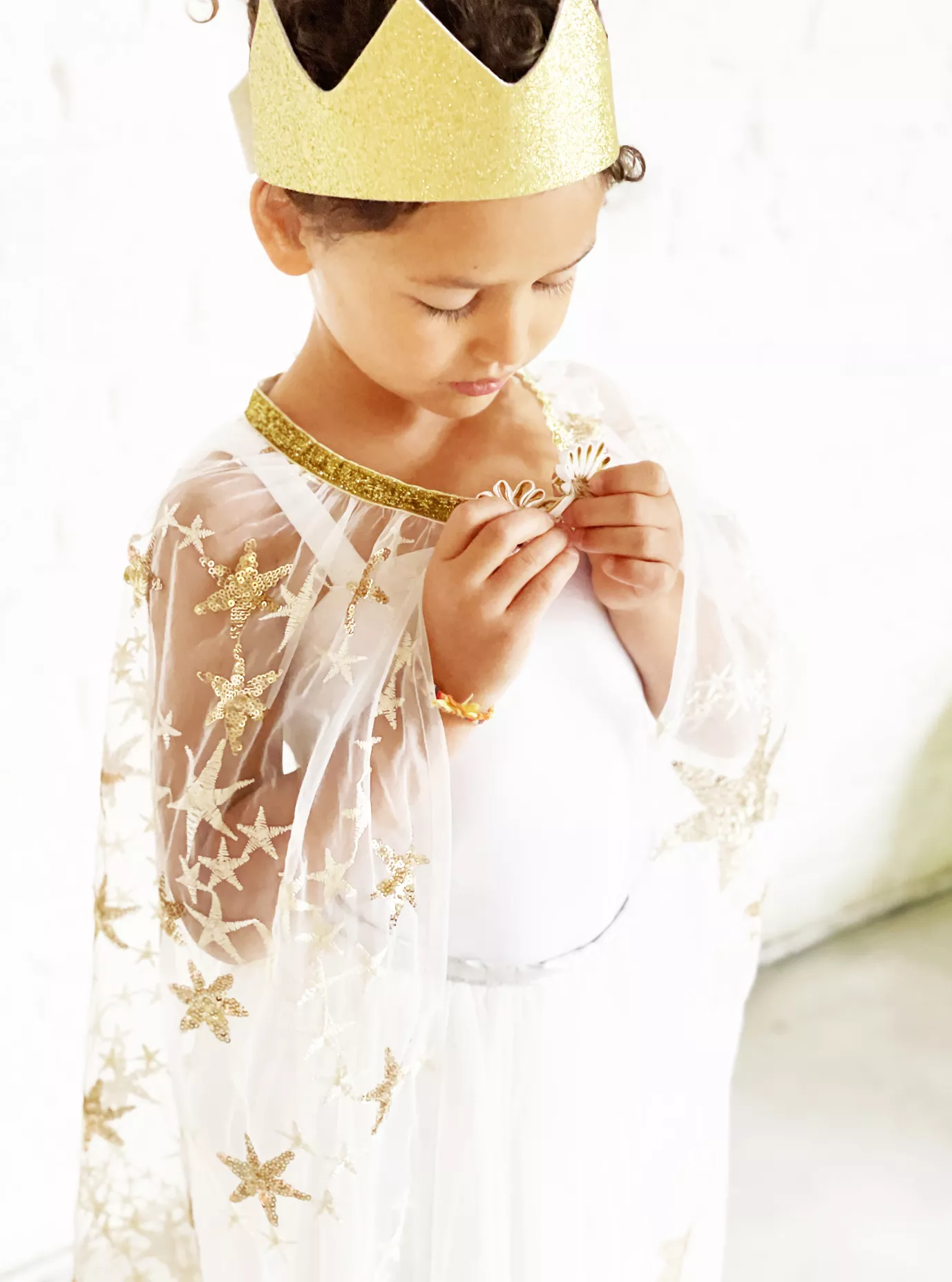 Créé par Ratatam, le KIT QUEEN est un set complet de déguisement comprenant: 1 cape brodée de sequins dorés ( qui se noue au cou grâce à un système d’attaches à l’encolure) + 1 couronne pailletée dorée ajustable au tour de tête grâce à un système de patch velcro. Who’s gonna be the dancing queen? Taille unique (convient aux enfants de 3 à 8 ans)