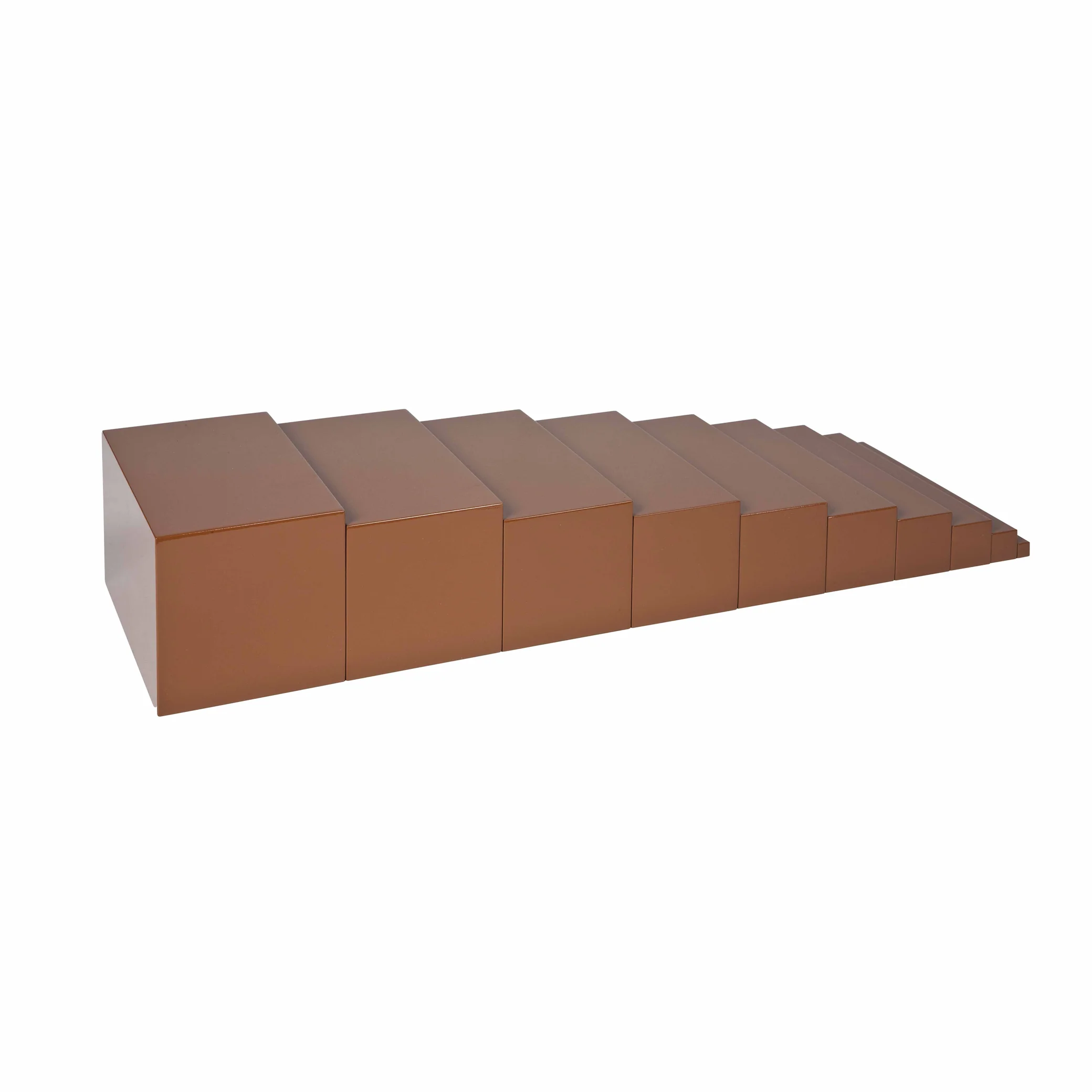 Cette série de prismes démontre à l’enfant le changement de largeur (largeur), alors que la longueur reste constante. La pratique de l’escalier brun prépare indirectement l’enfant aux concepts de géométrie plane, d’aire et de volume. Les prismes sont fabriqués selon des progressions précises de 1 x 1 x 20 cm à 10 x 10 x 20 cm