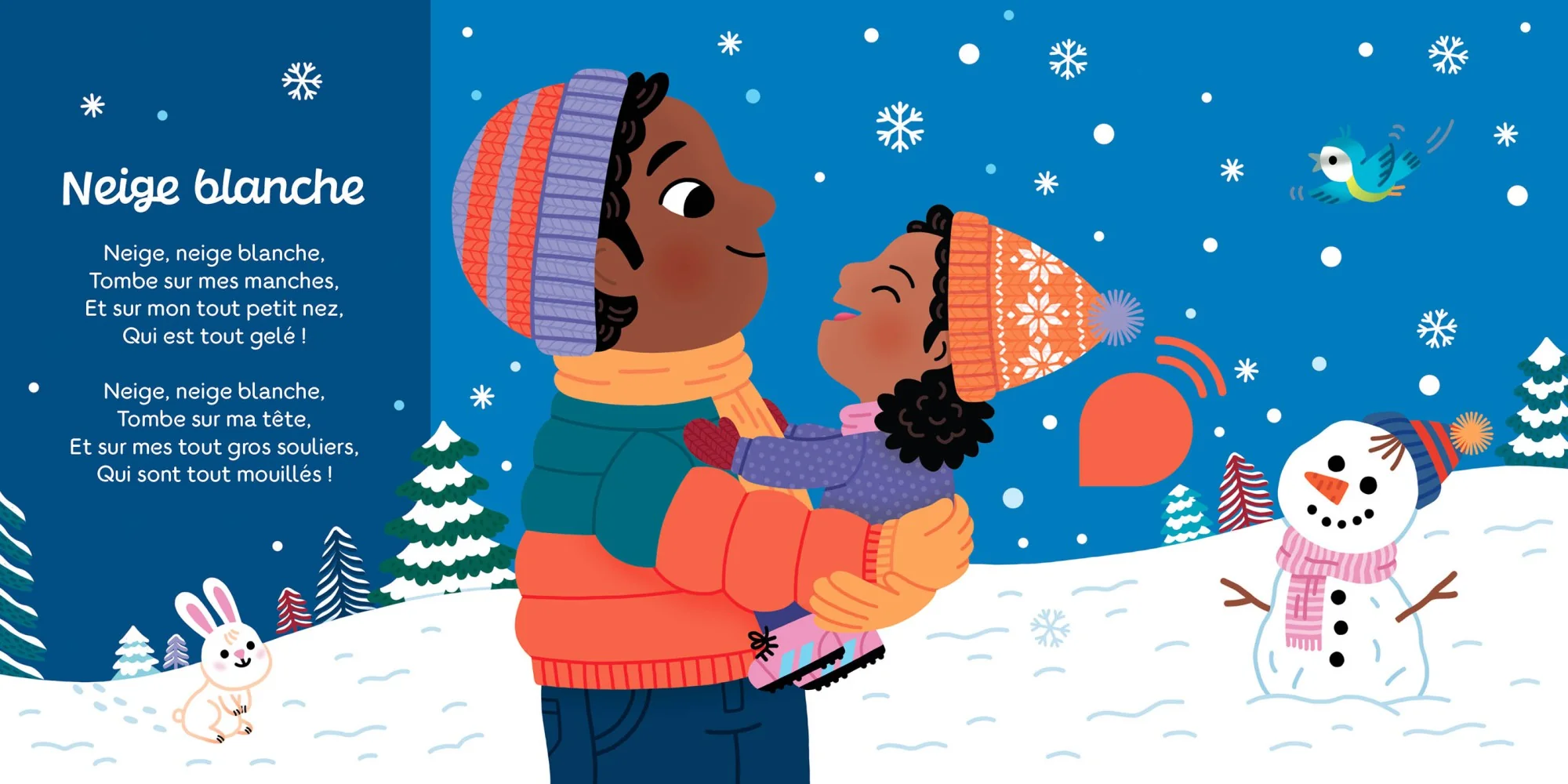Des comptines courtes, faciles à mémoriser, chantées en crèche et en maternelle. L’ouvrage contient un bouton on/off (pour durer plus longtemps) et des piles AAA (faciles à changer) 6 comptines : – Brille Brille Petite Étoile– Frère Jacques– Je t’aime Papa, Je t’aime Maman– Neige Blanche– Mon Petit Lapin– Douce Nuit 12 pages