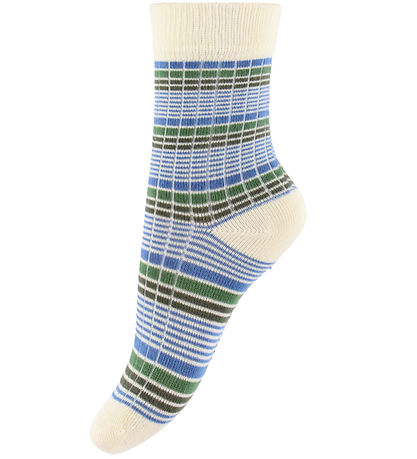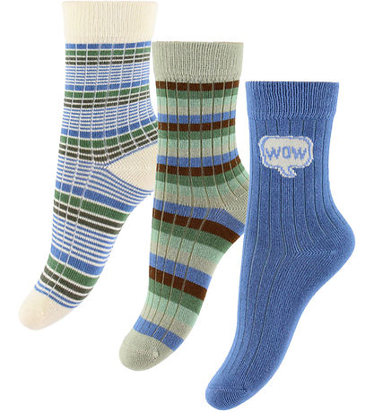 Lot de 3 Pack de chaussettes MiniPop uniques. Le lot contient des chaussettes à motif bleues, blanches, vertes et marron, ainsi qu’une chaussette bleue imprimé d’une bulle de dialogue avec le texte « WOW ». Les chaussettes MiniPop sont dotées d’une structure côtelée confortable et d’un bord élastique en haut. Les Chaussettes sont fabriquées en bambou doux.