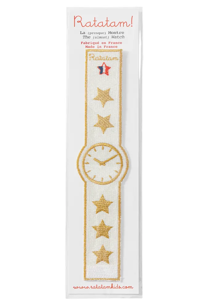 On a créé ce bracelet montre en tissu trop mignon ! Brodée avec du fil doré ou rouge et réglable en fonction de la taille du poignet. On entend déjà notre bout’chou dire « 10 h 10 !, mais je suis déjà en retard à mon cours d’aqua poney ! » Disponible dans deux coloris/motifs : Cœurs Rouges ou Étoiles dorées Fabrication française en fils brodés Longueur de la montre environ 17.5 cm Fermeture Velcro