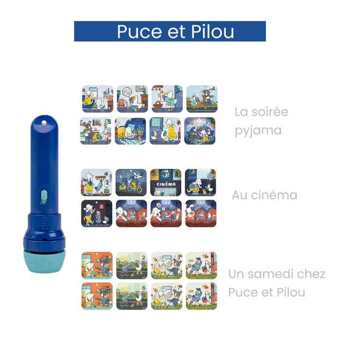 Imaginer et raconter des histoires devient un jeu d’enfant avec la lampe torche de poche! Comprend une lampe à projeter et 3 disques pour imaginer de belles histoires avant de s’endormir le soir. On éteint la lumière pour que la magie opère et c’est parti…