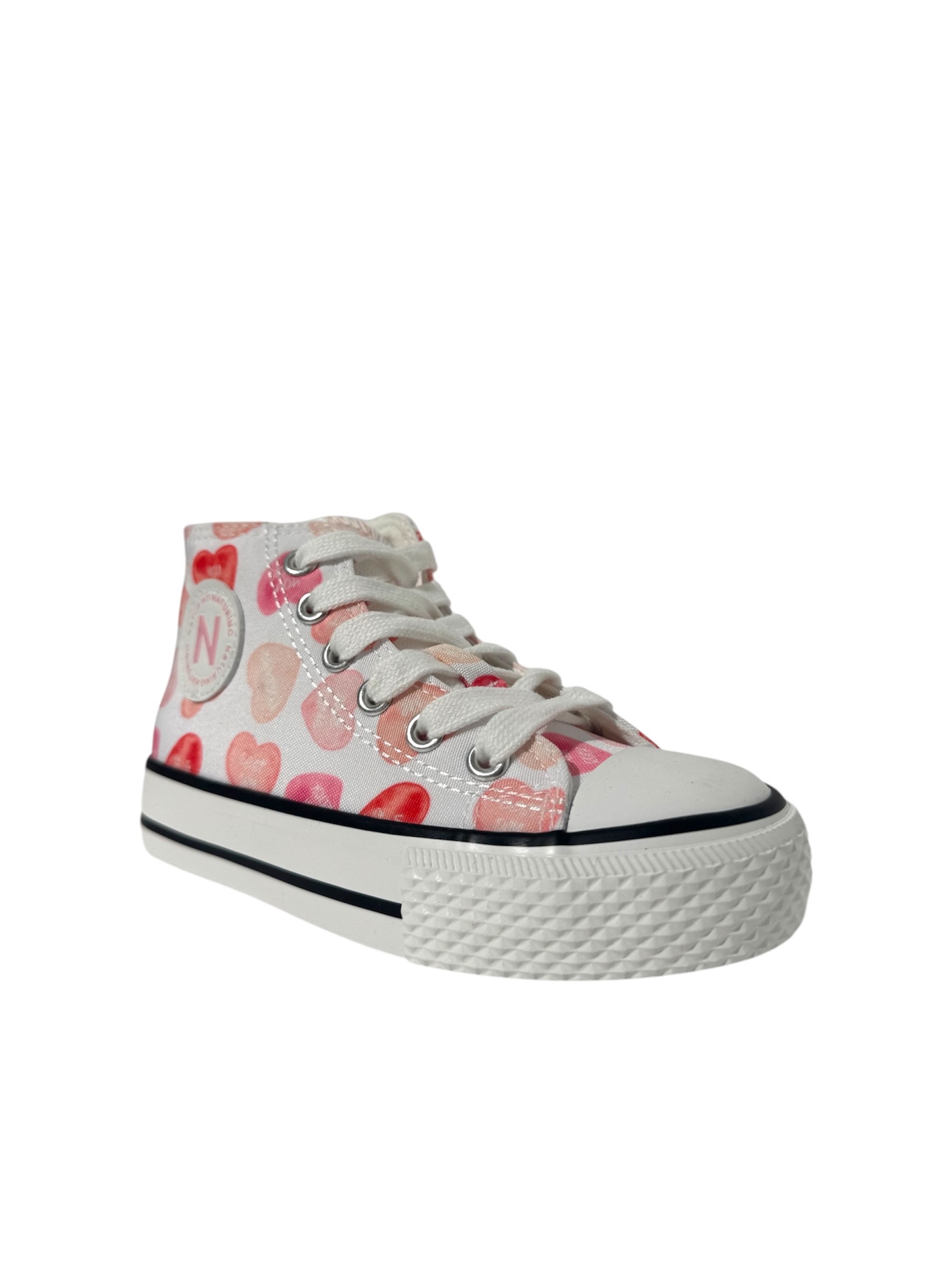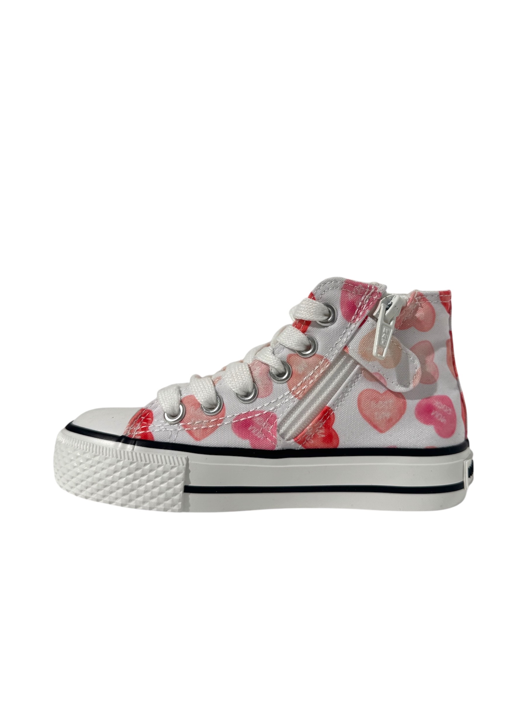 Basket montante avec tige en toile ornée de petits cœurs et écusson latéral avec logo. Fermeture à lacets en coton et zip intérieur, semelle en caoutchouc avec détails de rayures contrastées et logo à l’arrière. Parfait pour la mi-saison et apporter une touche de fantaisie à la tenue !