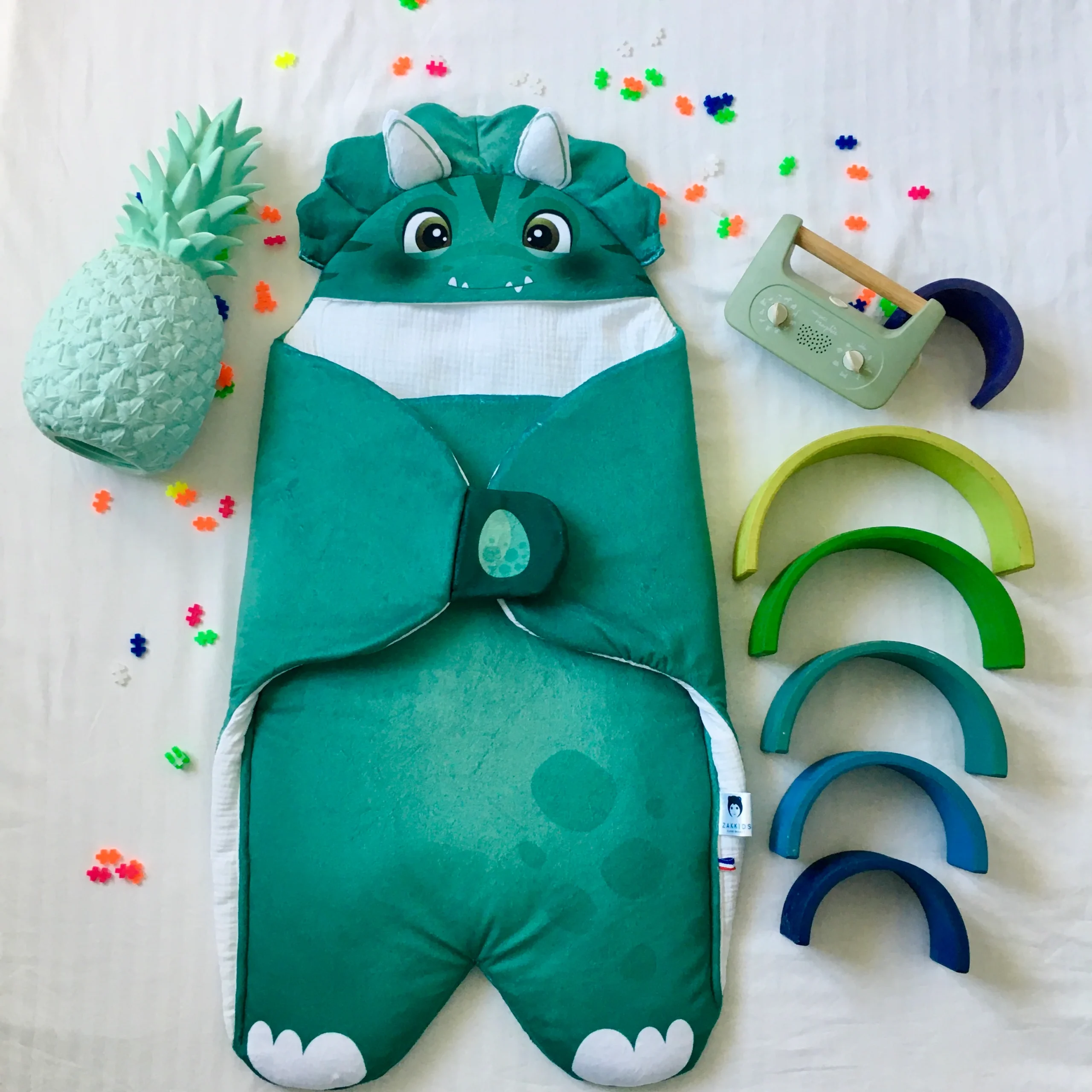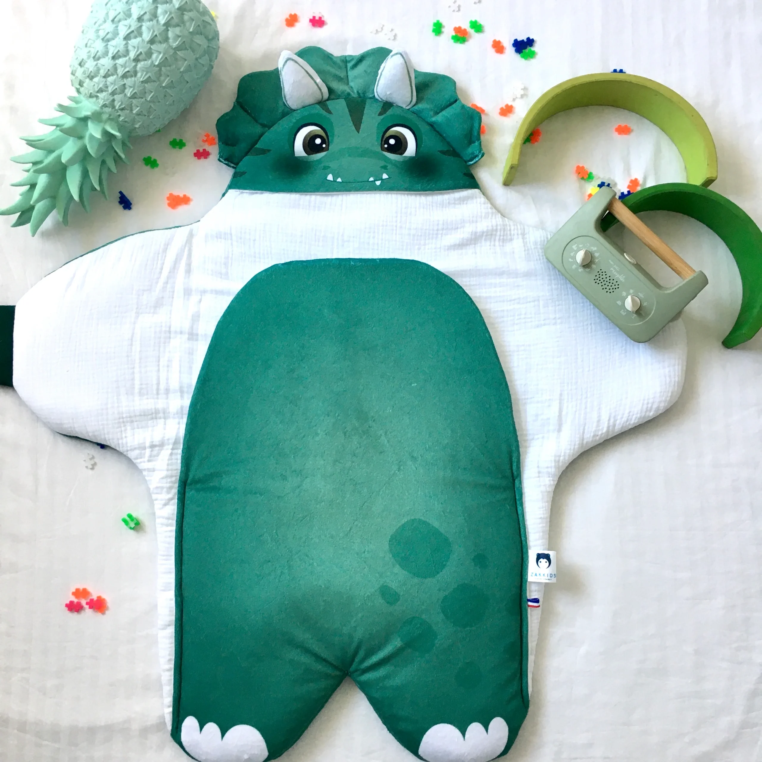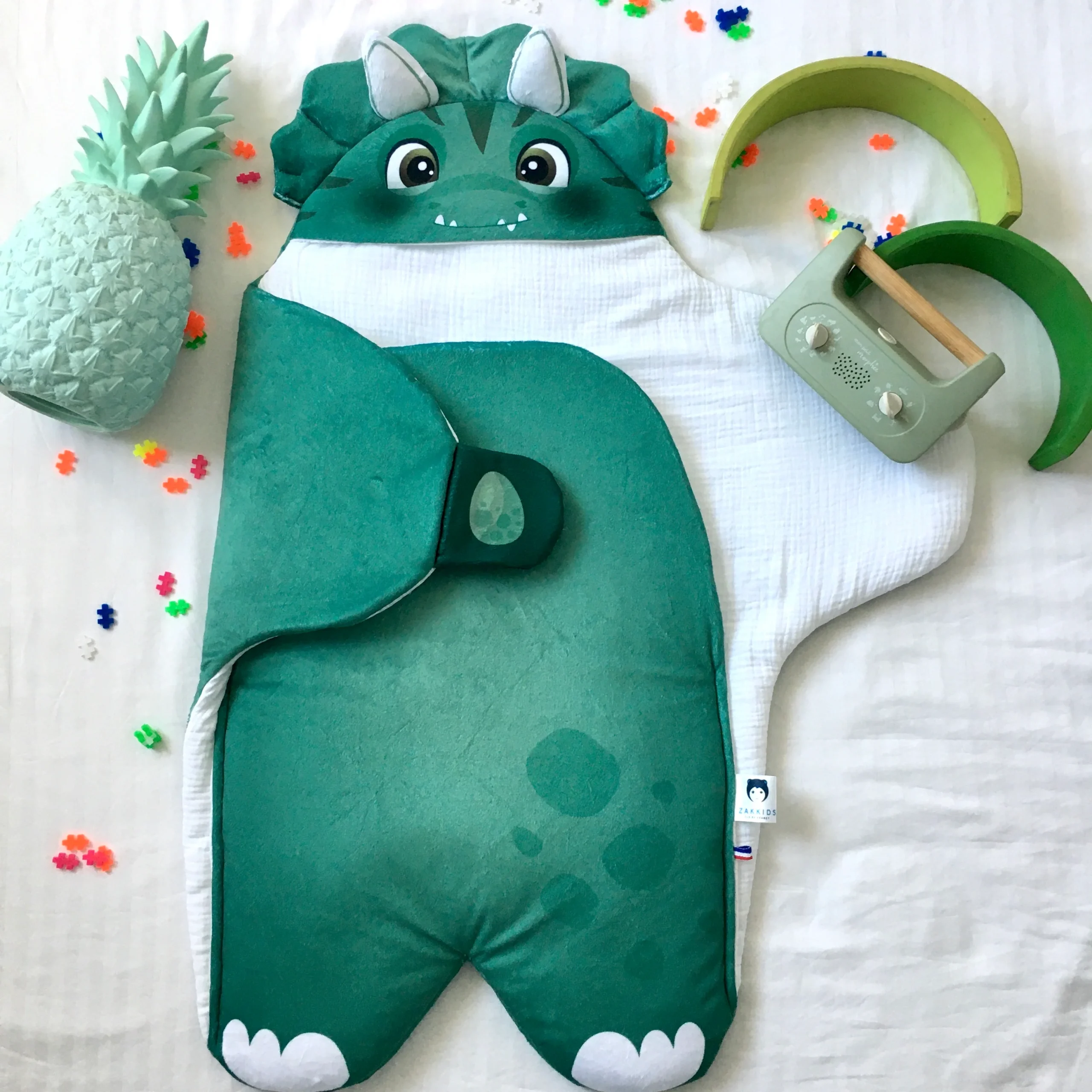 Velours vert d’eau, double gaze de coton blanc, bouille à croquer, tous les ingrédients sont réunis pour transformer bébé en joli petit dinosaure. Cette couverture bébé s’adaptera parfaitement à une décoration de chambre bébé sur le thème dinosaure ou dragon.
