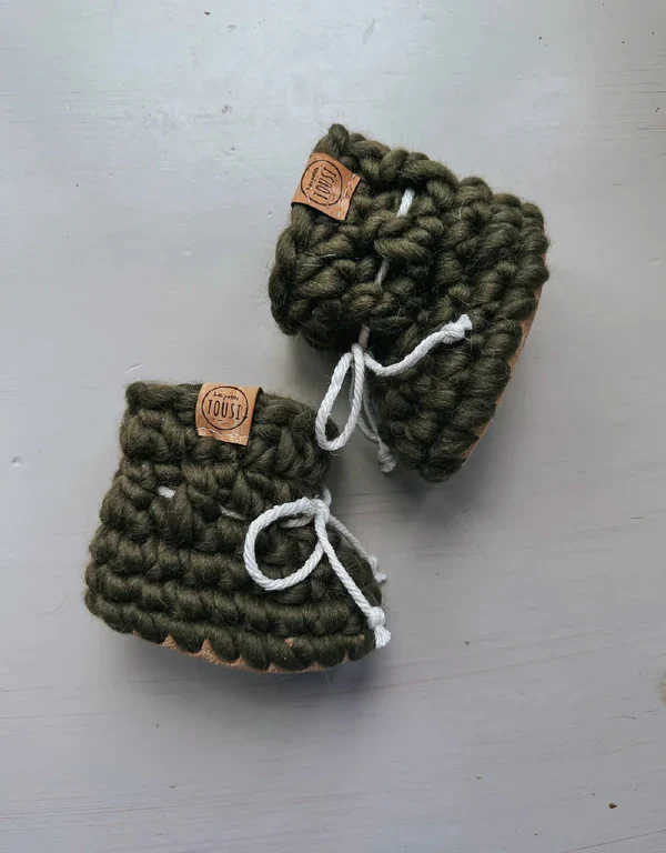 Magnifiques petites pantoufles crochetées à la main, fabriquées avec une douce laine de mouton péruvienne 100% naturelle, renouvelable et biodégradable. Leurs semelles, quant à elles, sont fabriquées à partir de retailles de cuir véritable doublé en poil de mouton. Non seulement ces petites pantoufles sont adorables, elles sont également anti-dérapantes pour les petits pieds qui apprennent à marcher en plus de tenir très bien en place grâce à un petit cordon de coton à la cheville.