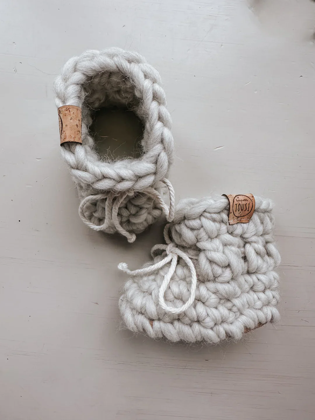Magnifiques petites pantoufles crochetées à la main, fabriquées avec une douce laine de mouton péruvienne 100% naturelle, renouvelable et biodégradable. Leurs semelles, quant à elles, sont fabriquées à partir de retailles de cuir véritable doublé en poil de mouton. Non seulement ces petites pantoufles sont adorables, elles sont également anti-dérapantes pour les petits pieds qui apprennent à marcher en plus de tenir très bien en place grâce à un petit cordon de coton à la cheville.