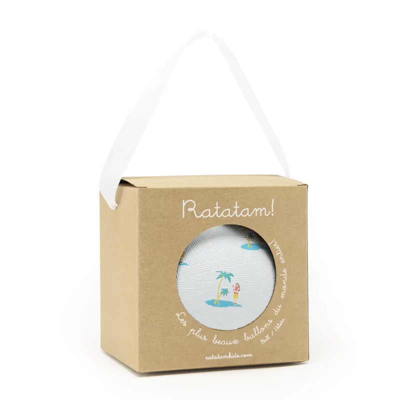 Le Ballon Hawai est placé dans une petite boîte en kraft avec lien pour le porter plus facilement.