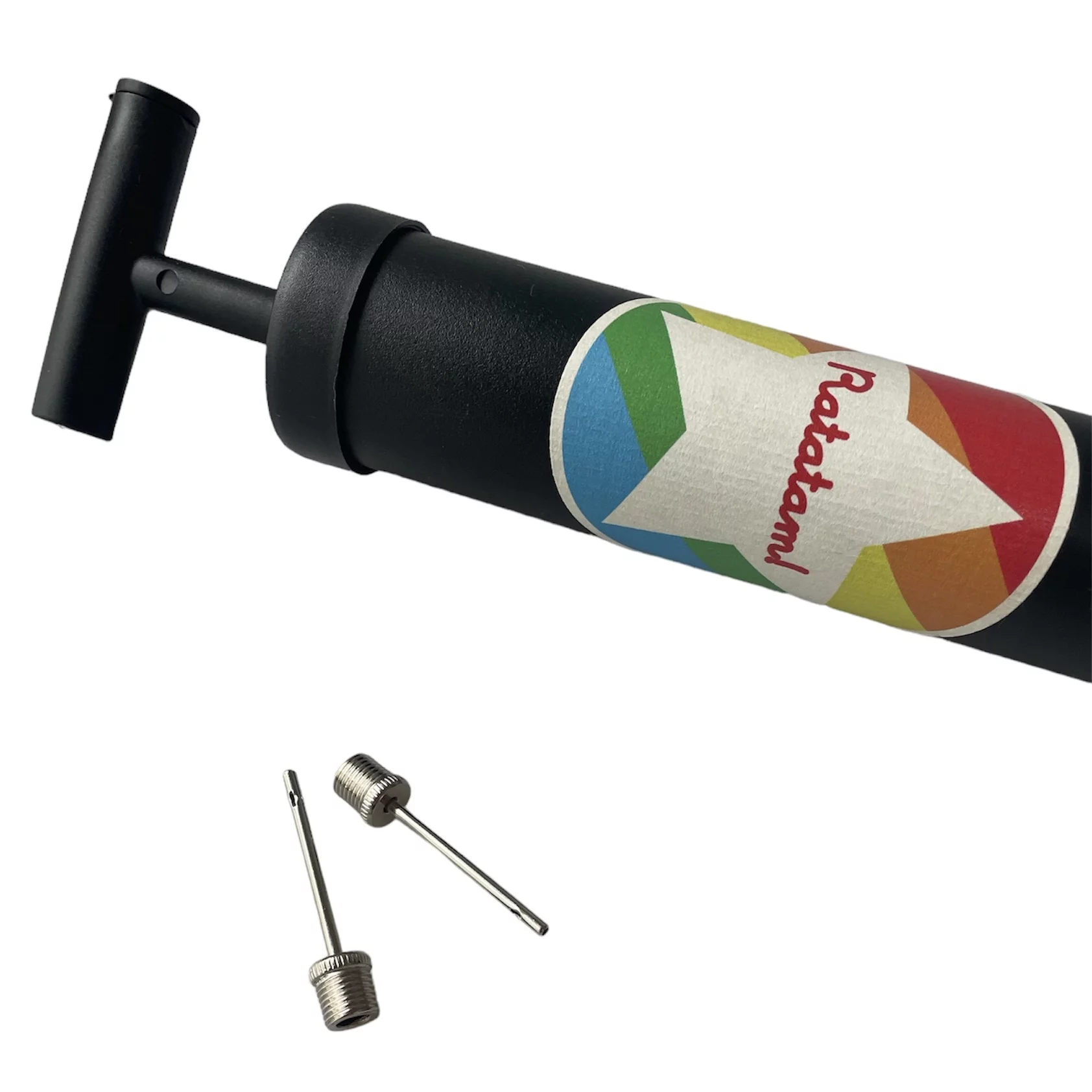 Équipée de deux tiges pour un gonflage rapide et efficace, cette pompe noire, ornée du logo Ratatam Kids est ultra pratique !