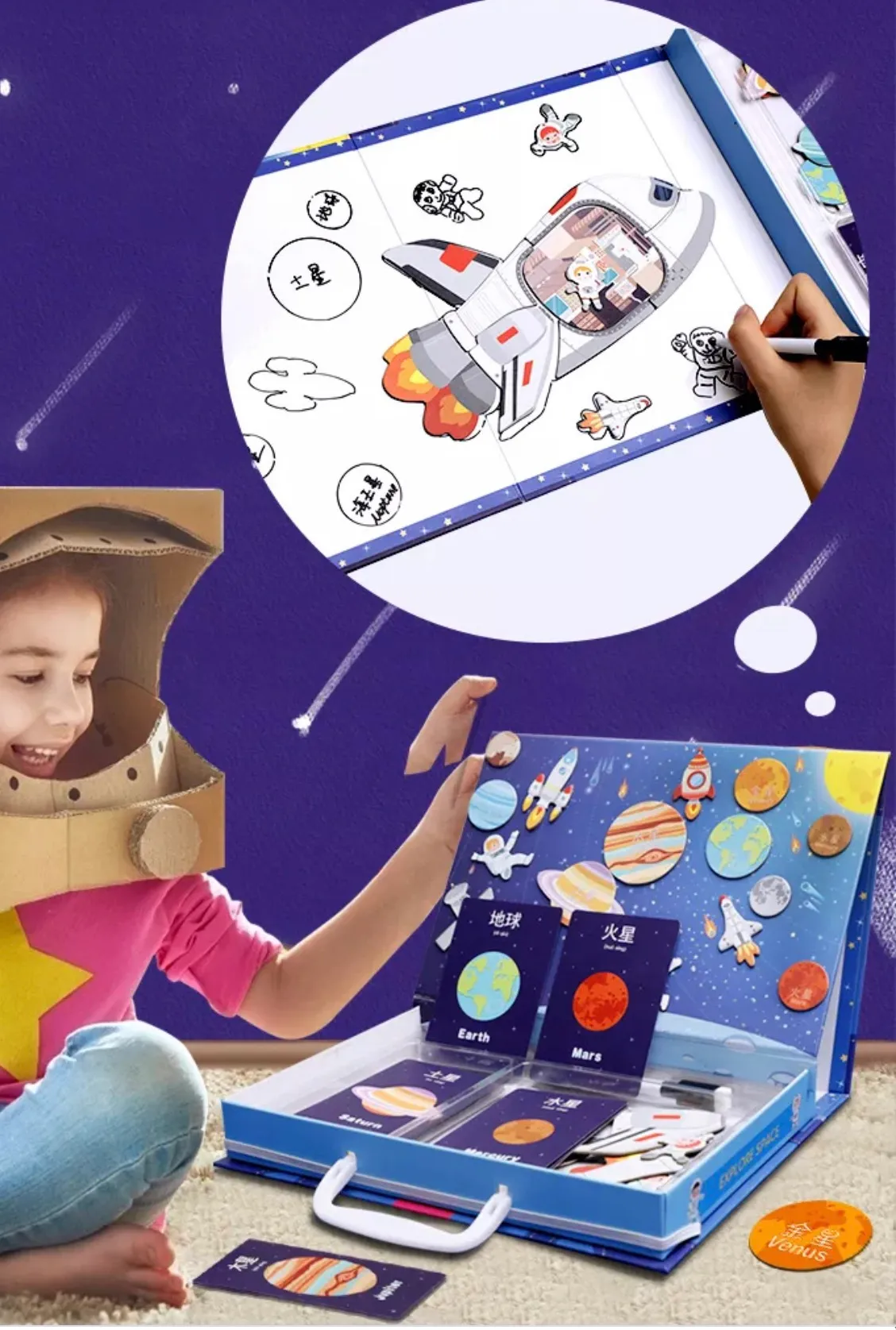 Ce jeu éducatif, magnétique, coloré et d’observation en forme de valise sur le thème de l’espace est une belle activité car votre enfant va reconstituer son puzzle et donc découvrir les planètes et les satellites.