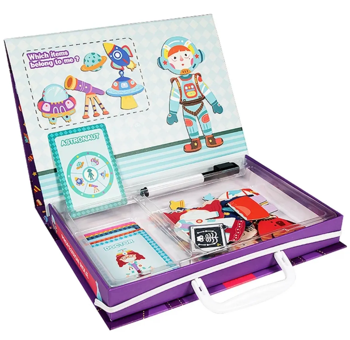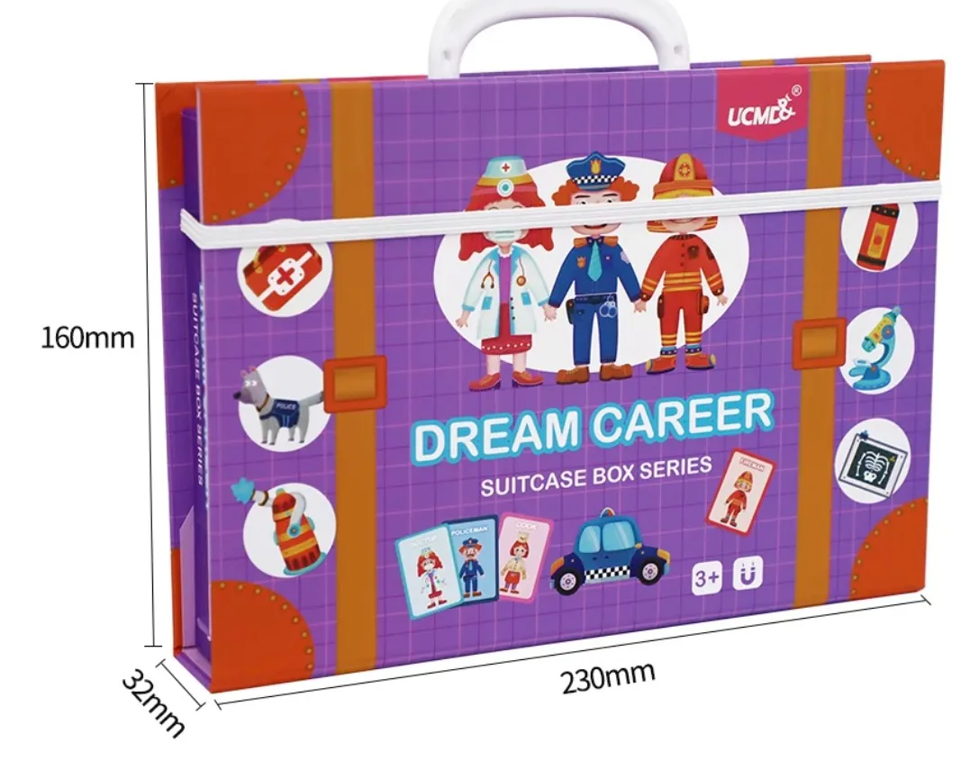 Avec ce jeu éducatif magnétique coloré en forme de valise, votre enfant découvrira plusieurs métiers, avec la possibilité d’en inventer plein d’autres.