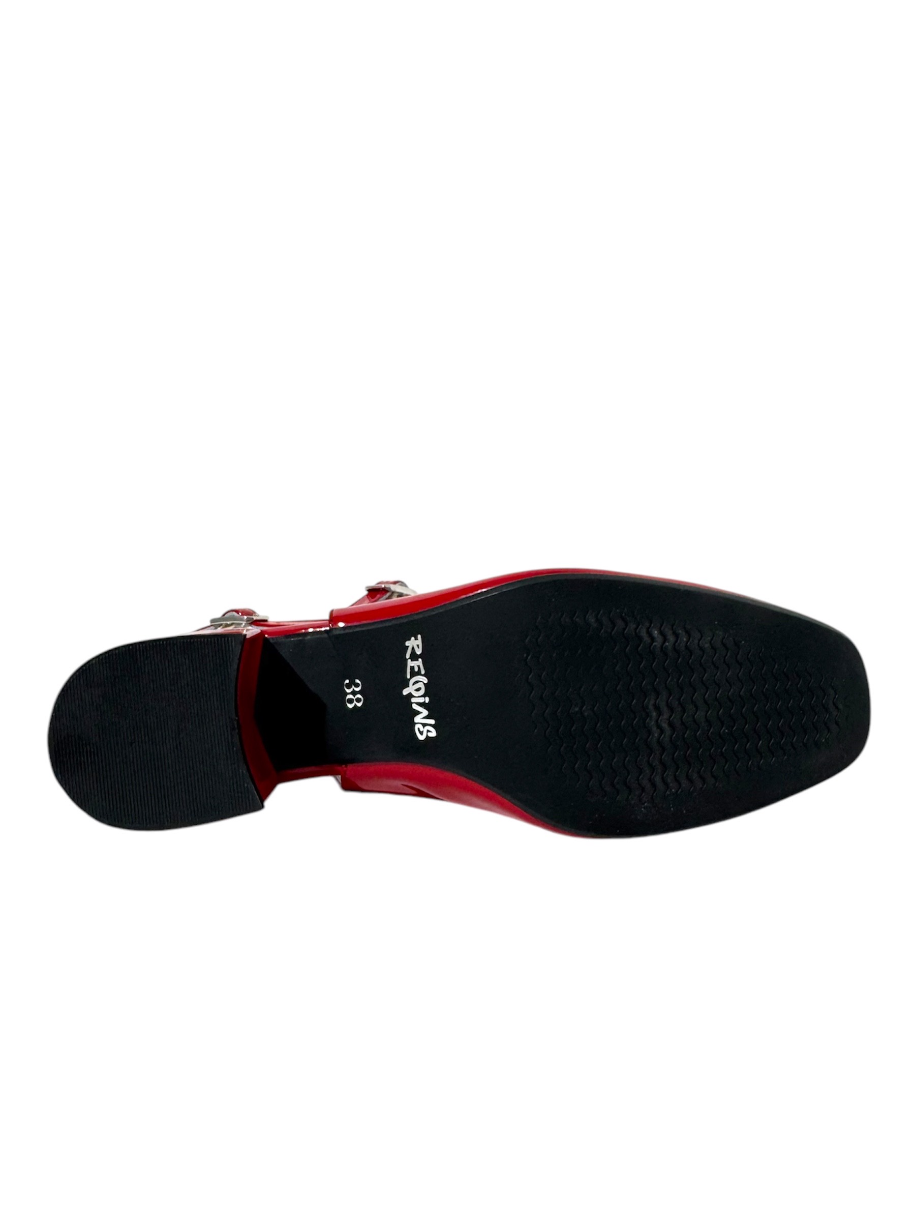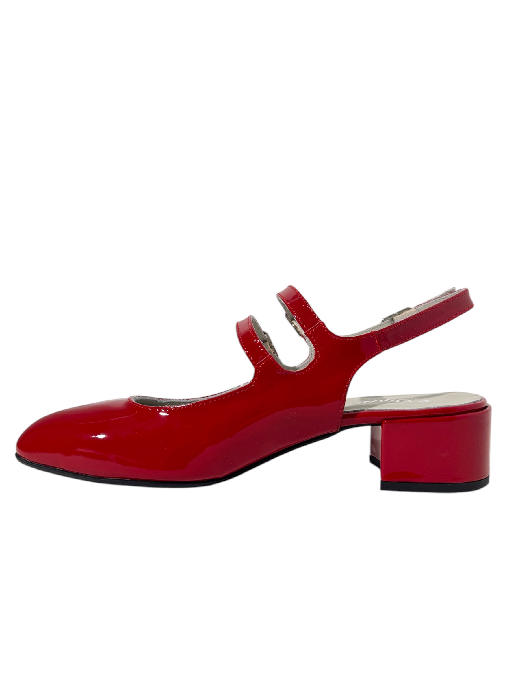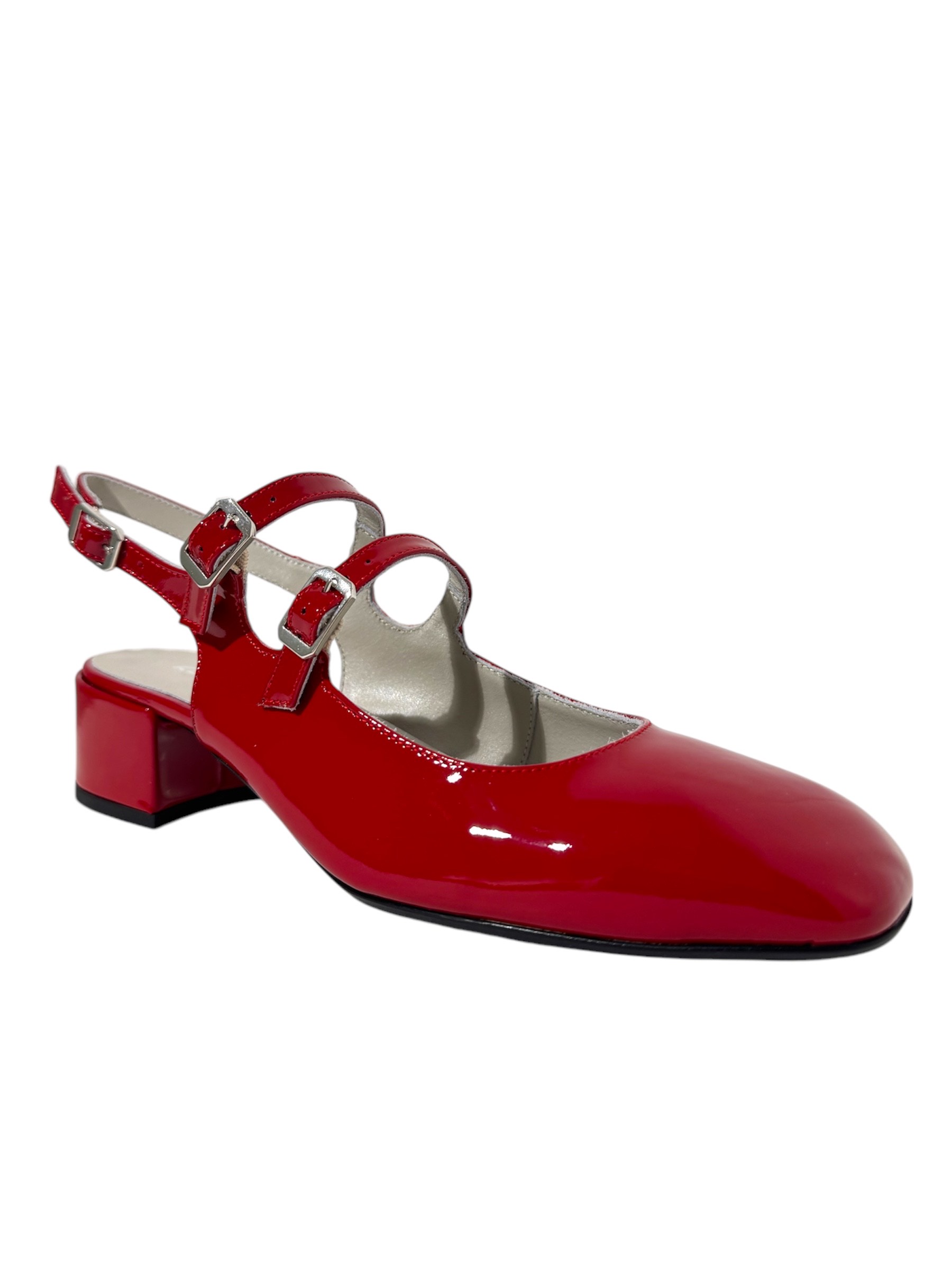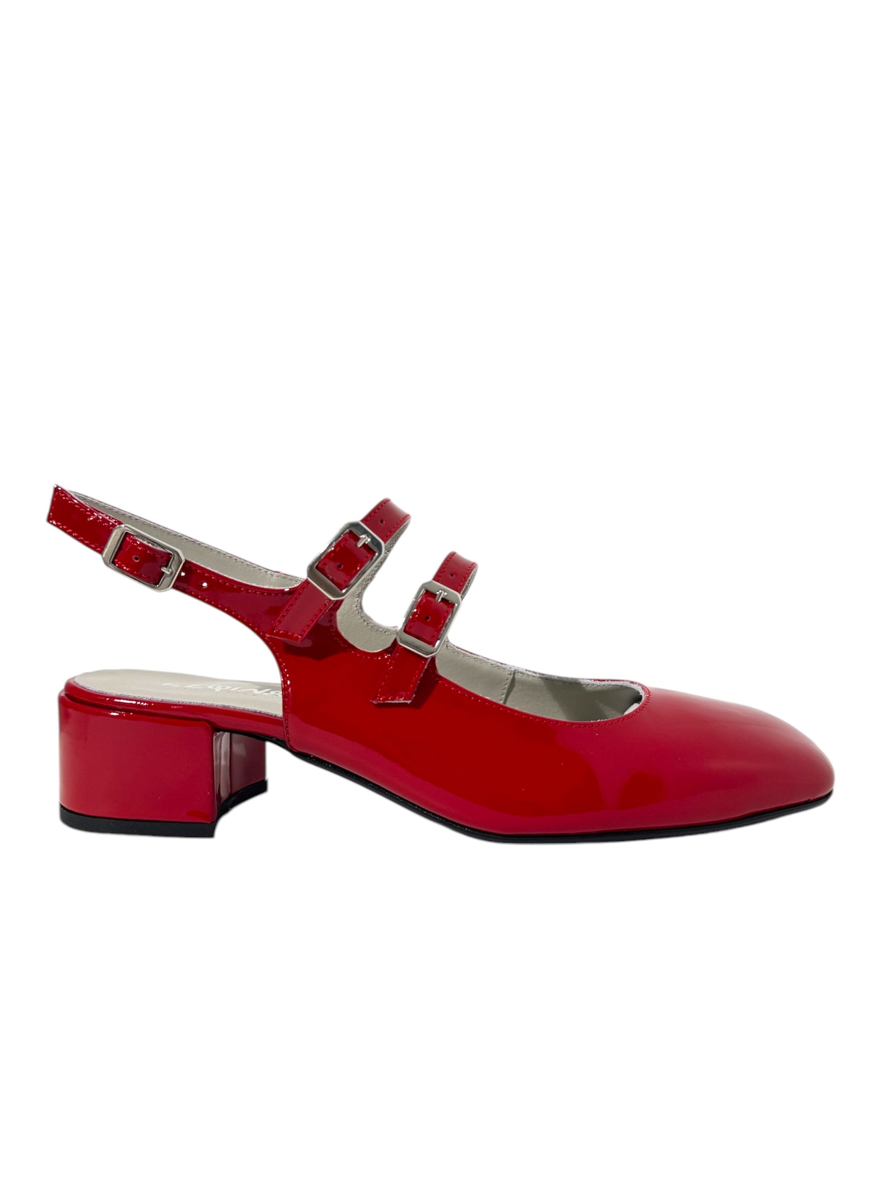 Les ballerines babies Reqins en cuir vernis rouge à talon et double bride apportent une touche rétro et sophistiquée à votre look. Leur finition brillante met en valeur leur design élégant, tandis que le talon apporte une légère élévation pour plus de féminité. La double bride assure un bon maintien du pied, parfait pour une allure chic et raffinée au quotidien ou pour des occasions spéciales.
