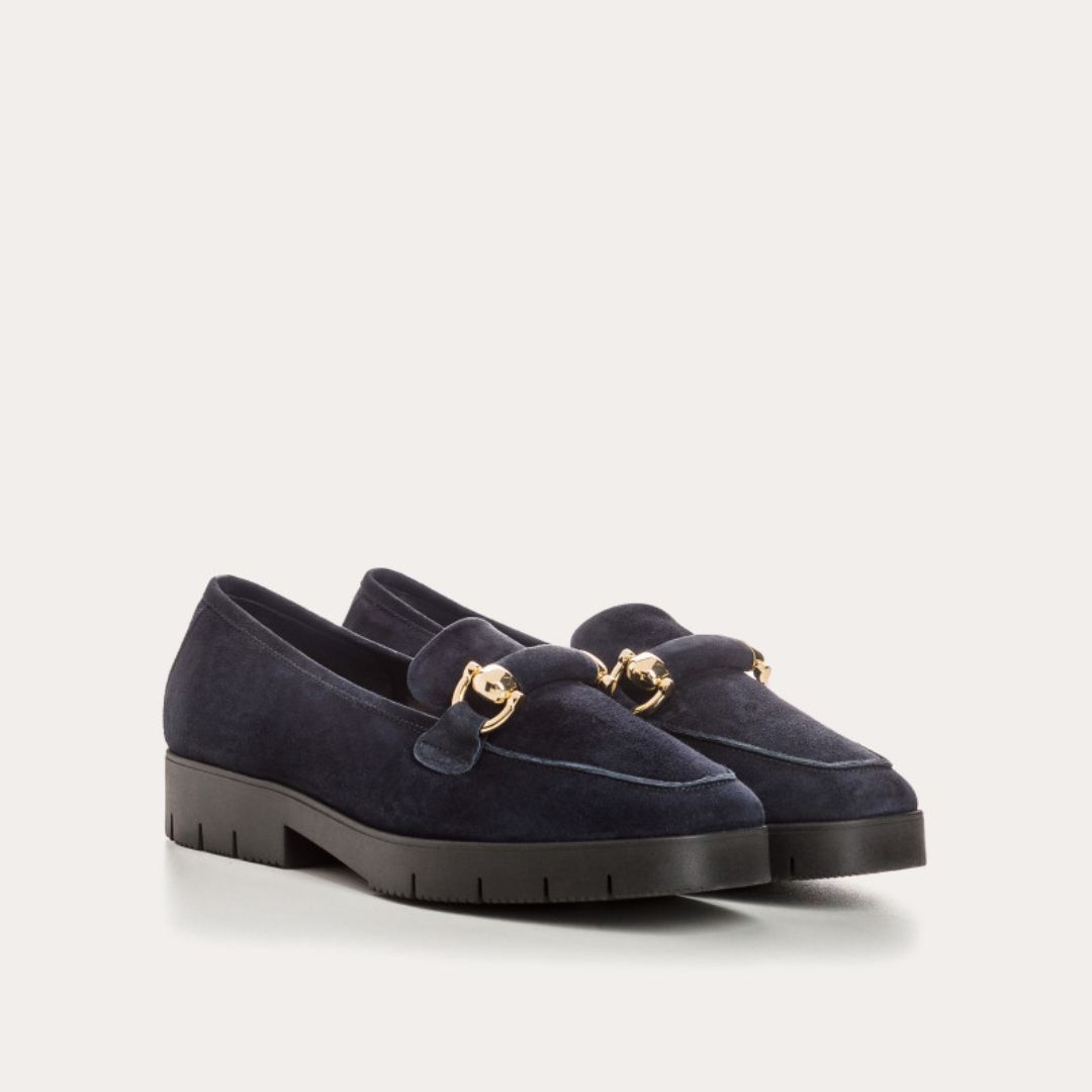 Affirmez votre style avec les Mocassins Muse en cuir velours dans la teinte élégante Nuit de chez Reqins. Ces mocassins bijoux sont parfaits pour ajouter une touche de sophistication à votre quotidien. Leur extérieur en cuir velours, complété par des accessoires en métal doré, incarne un raffinement intemporel. Les semelles crantées offrent à la fois une stabilité et un confort exceptionnels, tandis que le talon de 2,5 cm rehausse discrètement votre silhouette.