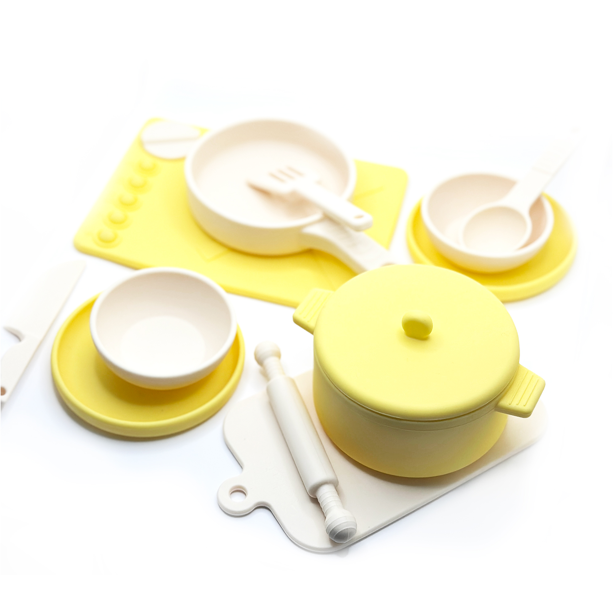 Bienvenue dans la cuisine des petits chefs en herbe ! Avec ce set de dînette en silicone jaune, prépare des repas délicieux et rigolos pour toutes tes peluches et poupées. Laisse libre cours à ton imagination en créant des plats fantastiques et en jouant au chef étoilé ! 🌟👩🍳👨🍳