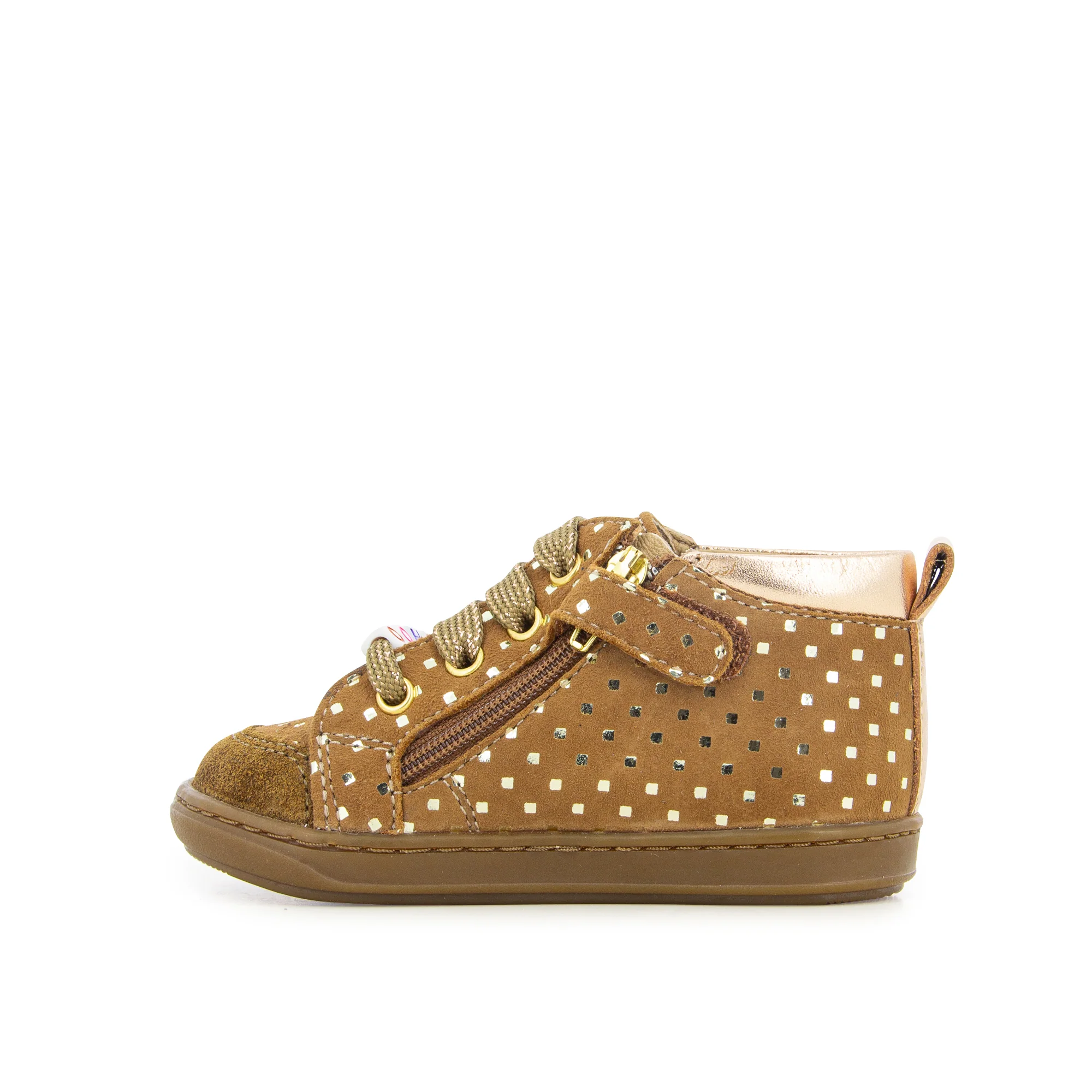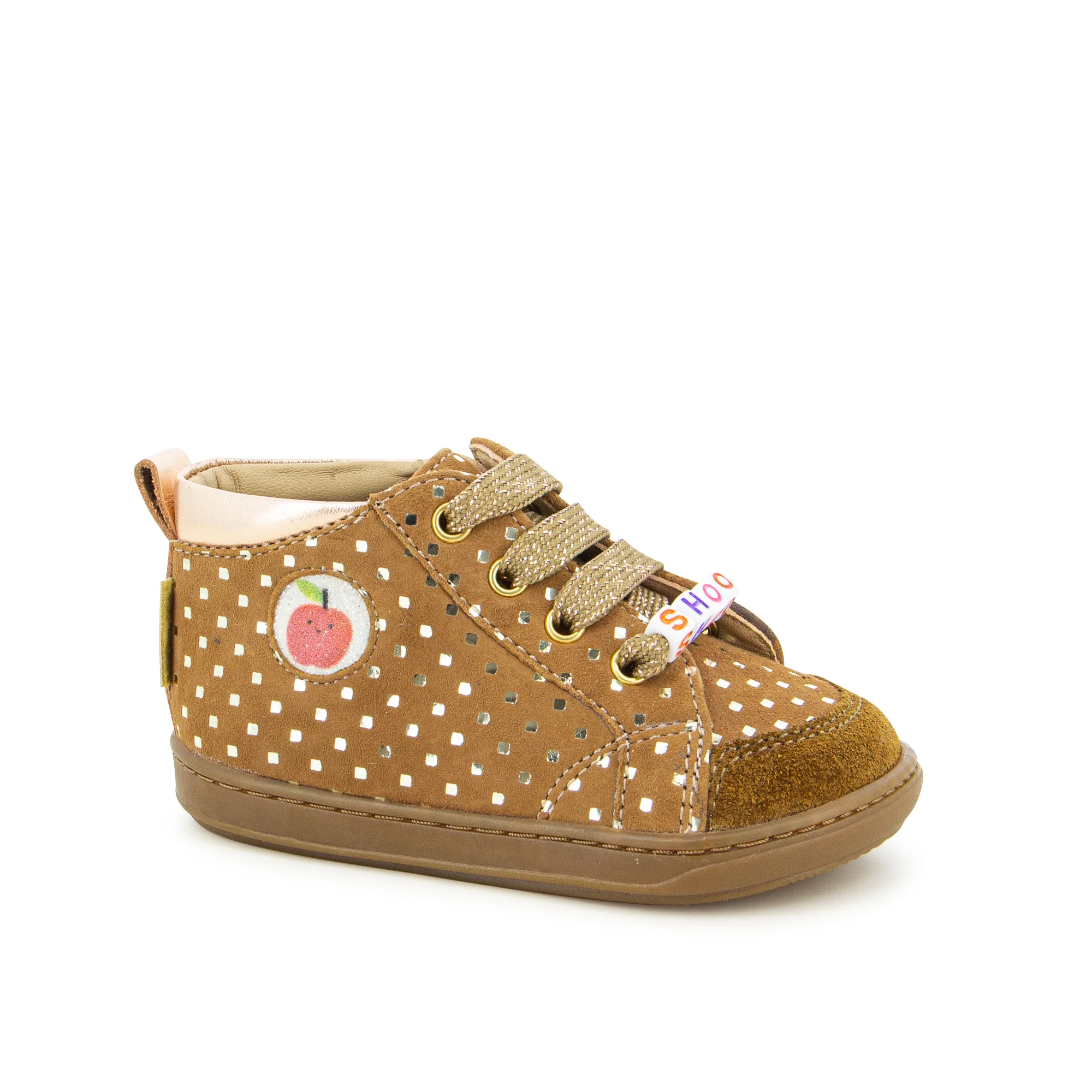 Découvrez les chaussures premiers-pas SHOOPOM Bouba Alphabet Camel, idéales pour accompagner les premiers pas de votre enfant. Confectionnées en velours camel à pois dorés, elles se distinguent par des lacets ornés de perles, apportant une touche élégante. Leur conception souple et légère, utilisant des matériaux de qualité, assure un développement optimal du pied et facilite l’apprentissage de la marche. La tige montante avec laçage garantit un excellent maintien de la cheville, tandis que le zip intérieur permet de les enfiler et de les retirer facilement. Attention, ce modèle taille petit, pensez à choisir une taille au-dessus