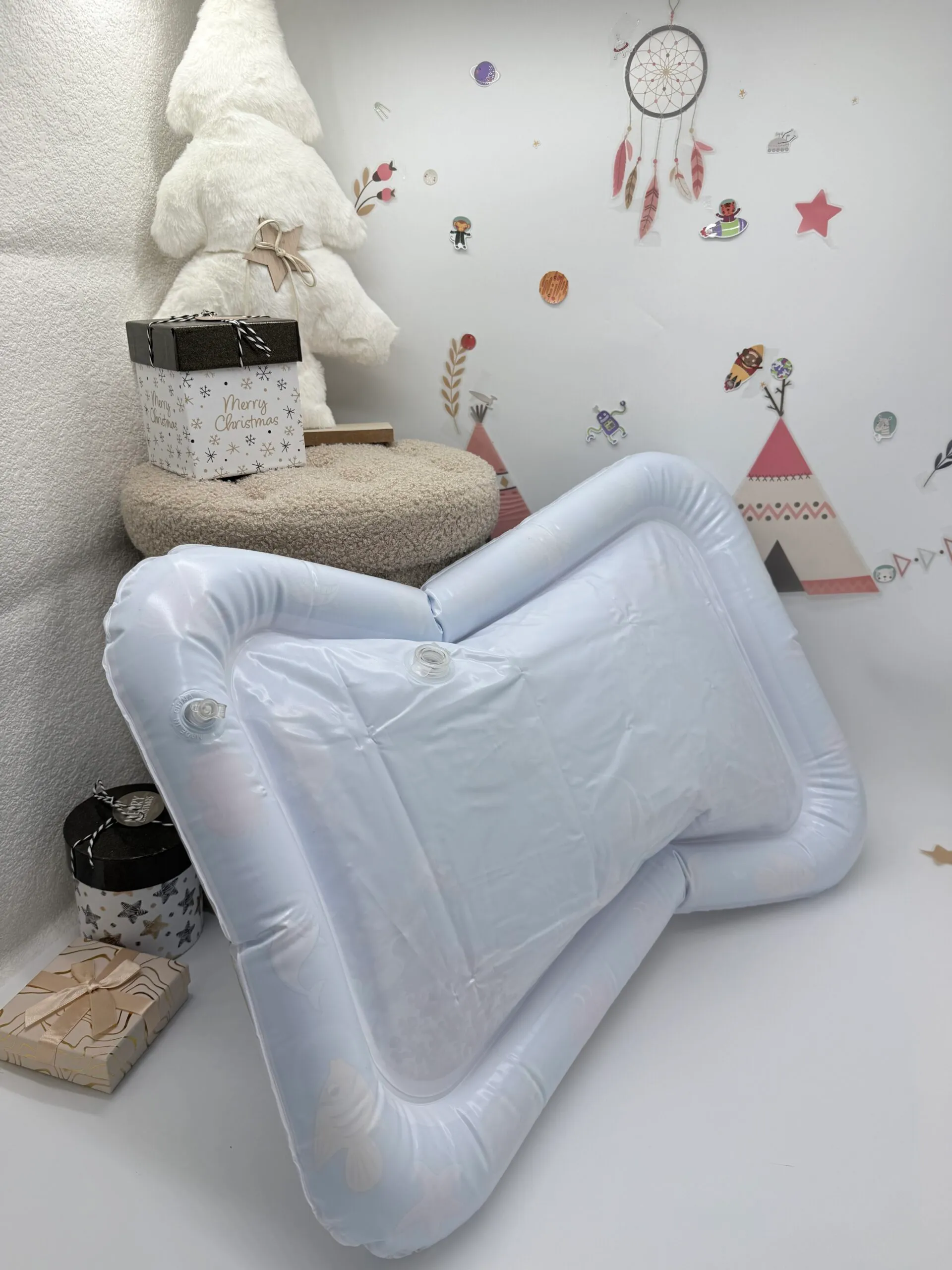 Rempli d’eau, ce tapis crée alors un effet visuel captivant. Bébé observe, touche et appuie sur les formes colorées flottantes, stimulant ainsi ses sens visuels et tactiles. Allongé sur le ventre ou le dos, bébé développe ainsi progressivement le contrôle de sa tête, de ses bras et de ses mains – une étape clé de son développement moteur.